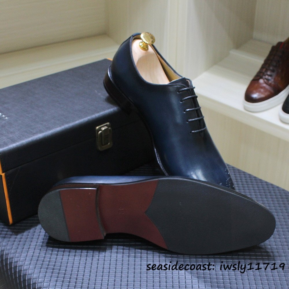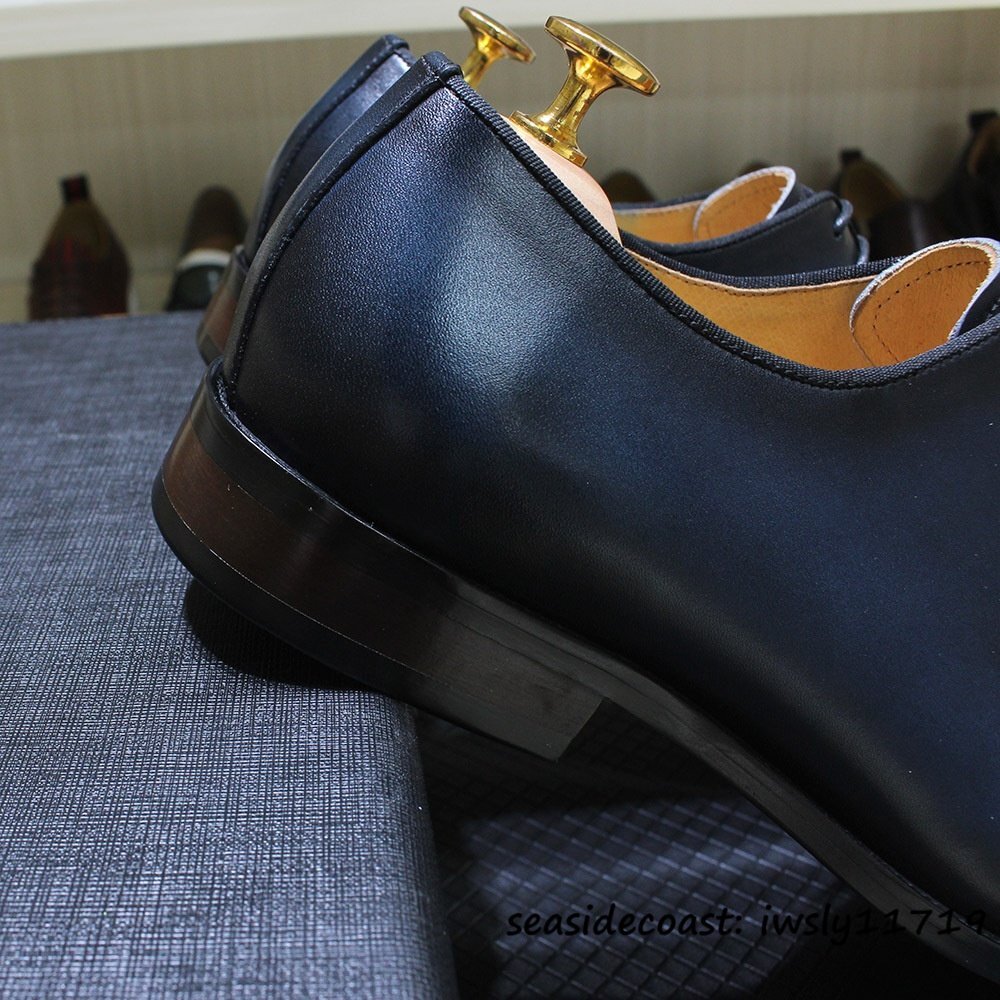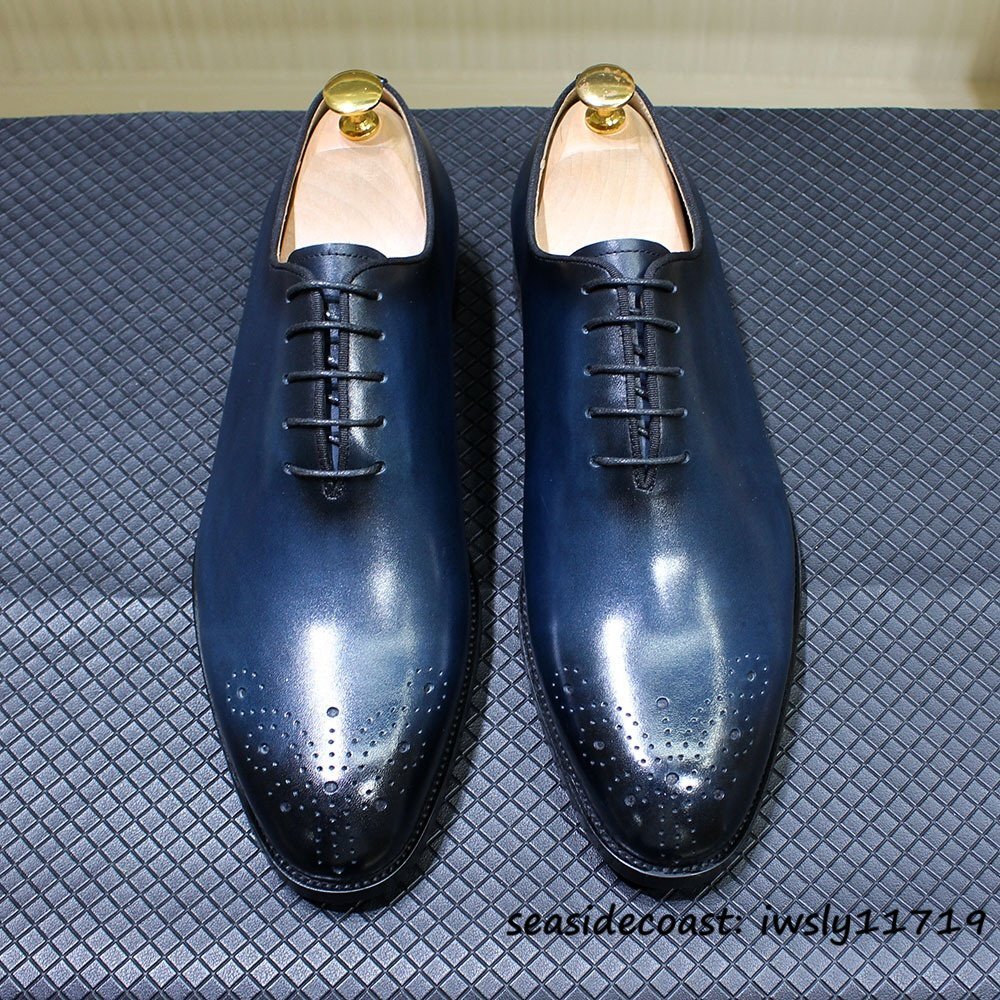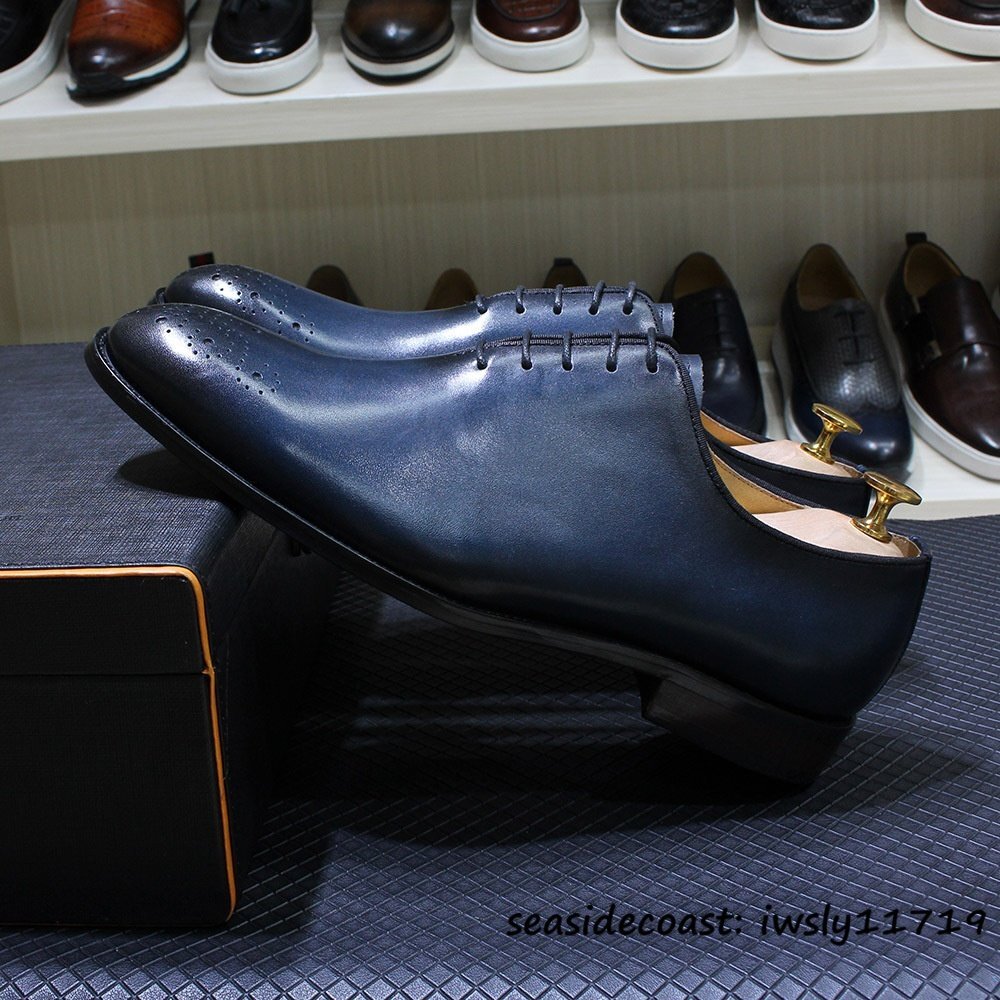 定価9万超■本革 レザーシューズ メンズ ビジネスシューズ 職人手作り 彫り 紳士靴 革靴 ドレスシューズ フォーマル 新品 ブルー 26.0cm