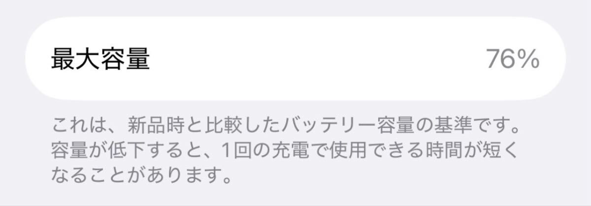 その他の注意点としてパッテリー最大容量は76%まで劣化してます。そのため安価に設定しています。パッテリー交換、予備での使用など必要な方がおられましたらよろしくお願いします。