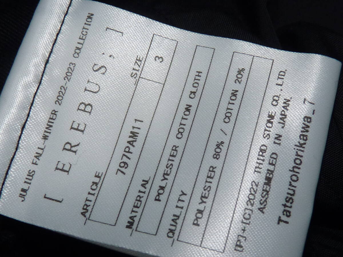| 【ブランド】 JULIUS ユリウス 【サイズ】 表記:3 腰幅:42センチ 股上:35.5センチ 股下:72.5センチ 裾幅:30センチ 【素材】 4枚目の写真をご参考にして下さい。 【品番】 797PAM11 【価格】 \97,900 【コンディション】 多少の着用感はありますが、 目立った汚れや破れ等も無く美品です。 この機会にいかがでしょうか。 | |