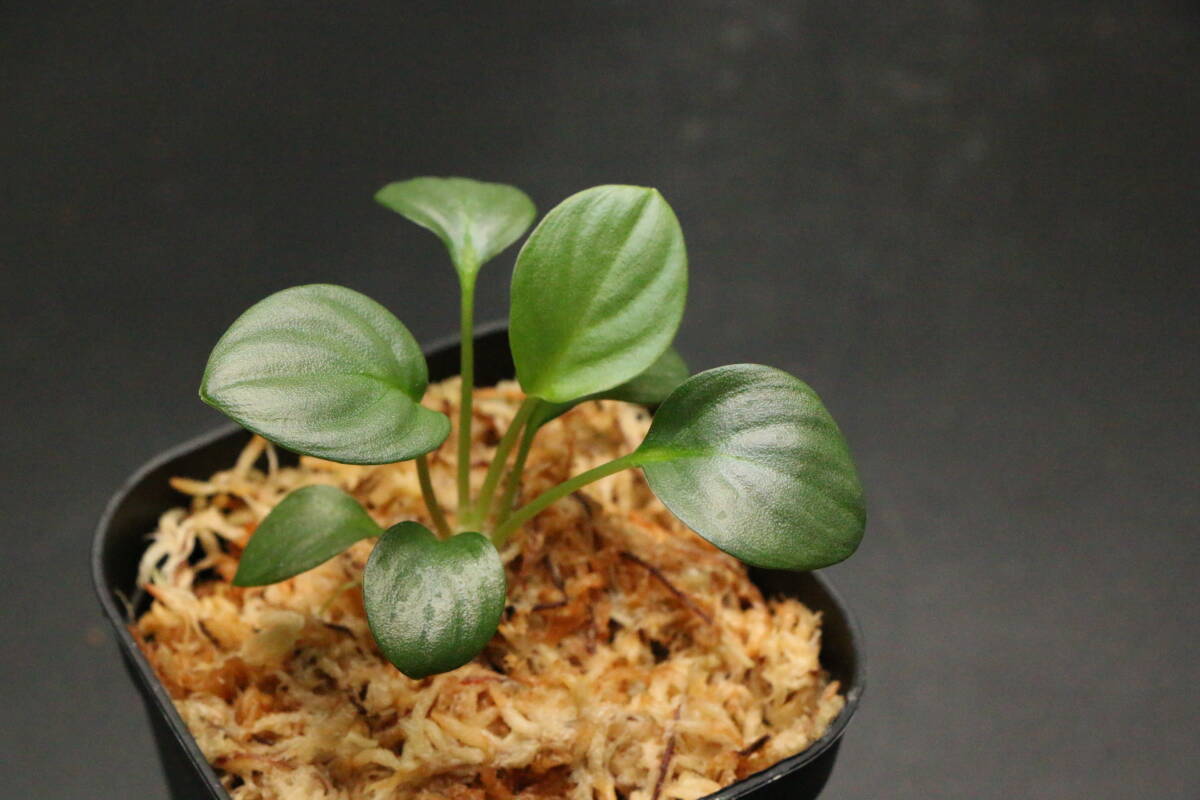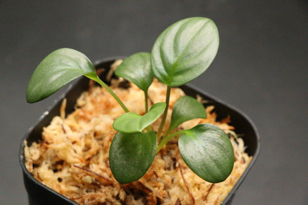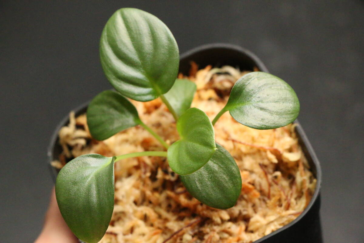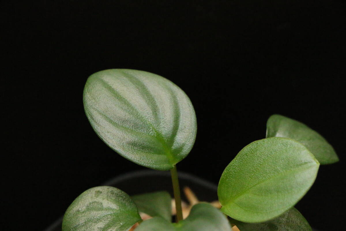 明るい緑のコインリーフで、銀鮫由来の葉の表面のざらつきがあります。