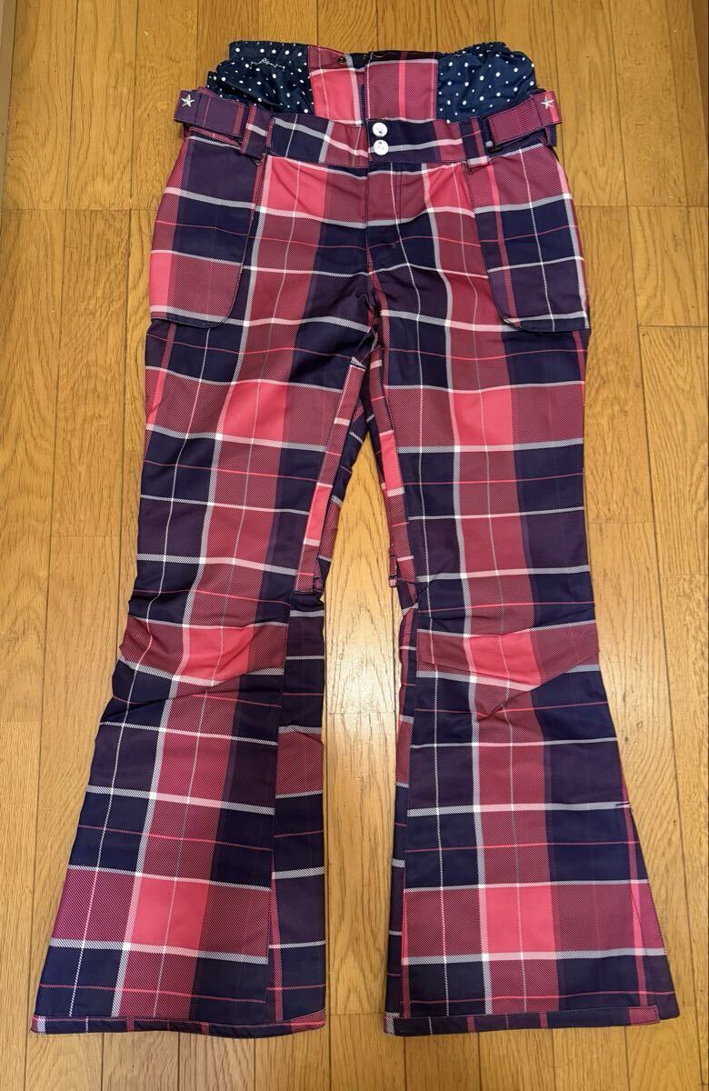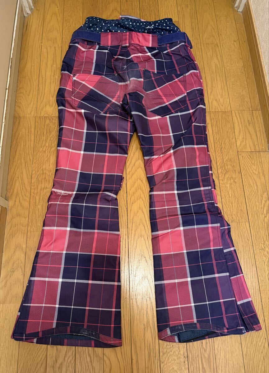 鮮やかなピンク×チェック柄が映える、レディース用スノーボードウェア上下セットです。