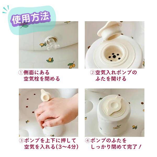 ご購入されましたらご希望のデザインをオーダーフォームにてご連絡ください。 ・オリーブ ※在庫切れ ・くま ・チューリップ 空気で膨らませるベビーチェア!赤ちゃんに快適な時間をプレゼント ★ポンプ一体型で簡単準備 本体に内蔵された空気入れポンプを使って、手動で簡単に空気を注入できます。 3~4分ほどでセット完了!使わないときは折りたたんでコンパクトに収納可能。 持ち運びもラクラクです。 ★どこでも大活躍! おうちではもちろん、実家や旅行先、ピクニックなどでも便利に使える万能チェア。 軽量設計で、赤ちゃんの離乳食タイムやおすわり練習、お昼寝中のサポートにもピッタリです。 ★赤ちゃんに優しい素材と安心設計 柔らかいPVCソフト素材で、赤ちゃんの体を優しくサポート。 底部は安定感のある滑り止め加工付きで、安全面も安心です。 ★プレゼントにも最適 可愛い韓国風のデザインとおしゃれなカラーは、赤ちゃんとママの心をくすぐります。 初めての離乳食やおすわりを応援するギフトとしてもおすすめです! 【対象年齢】 6ヶ月~3歳 ※お子様の成長に合わせて、保護者の方が使用可能かご判断をお願い致します。 【サイズ】 約48cm×57cm×35cm ※素材と製造工程から生じる個体差のため、表記のサイズと実際のサイズが多少異なる場合があります。 【デザイン】 ・オリーブ ・くま ・チューリップ |