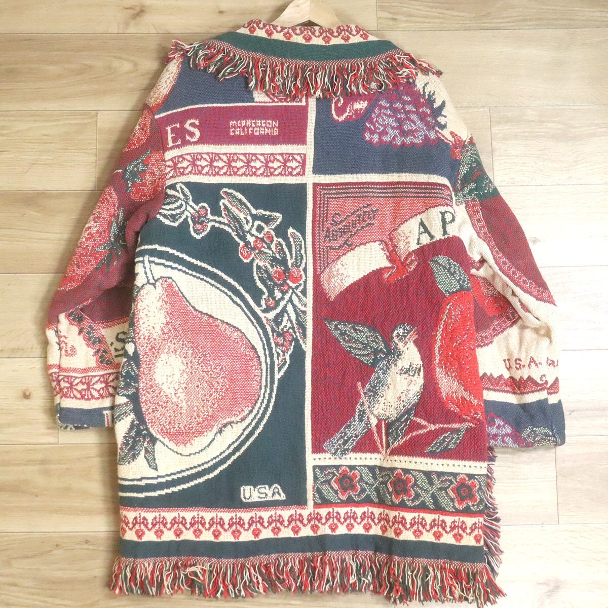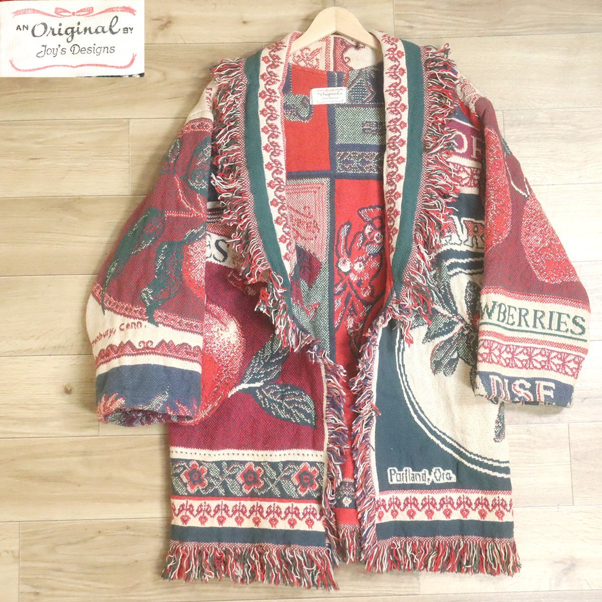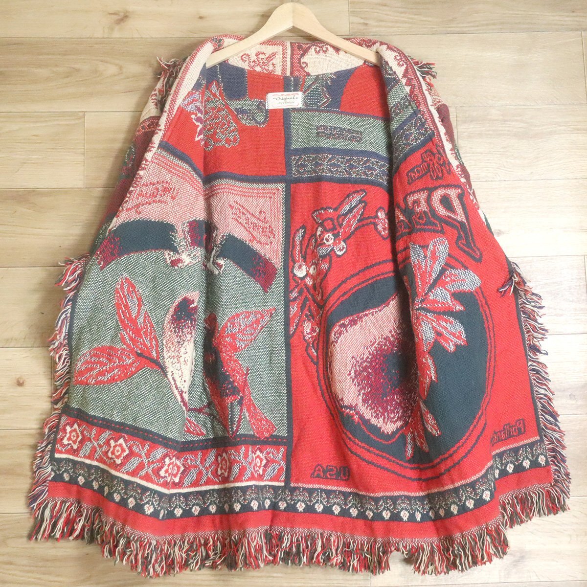 #1T/D11.24-2 ビンテージ JOY'S DESIGN ゴブラン ラグ ジャケット ガウン 鳥 フルーツ柄 ポンチョ 総柄 クレイジー