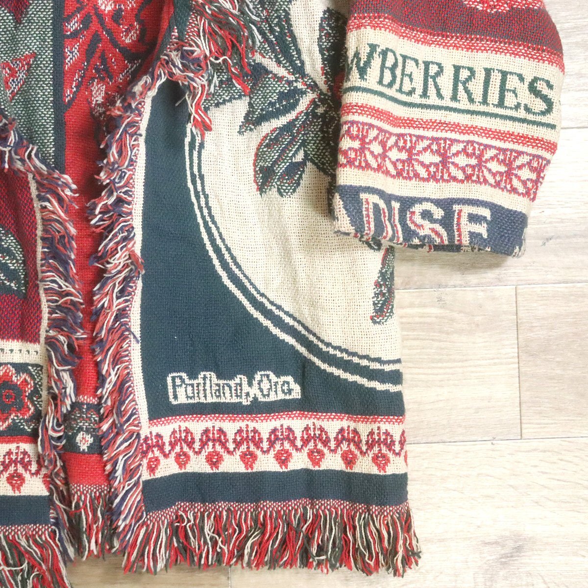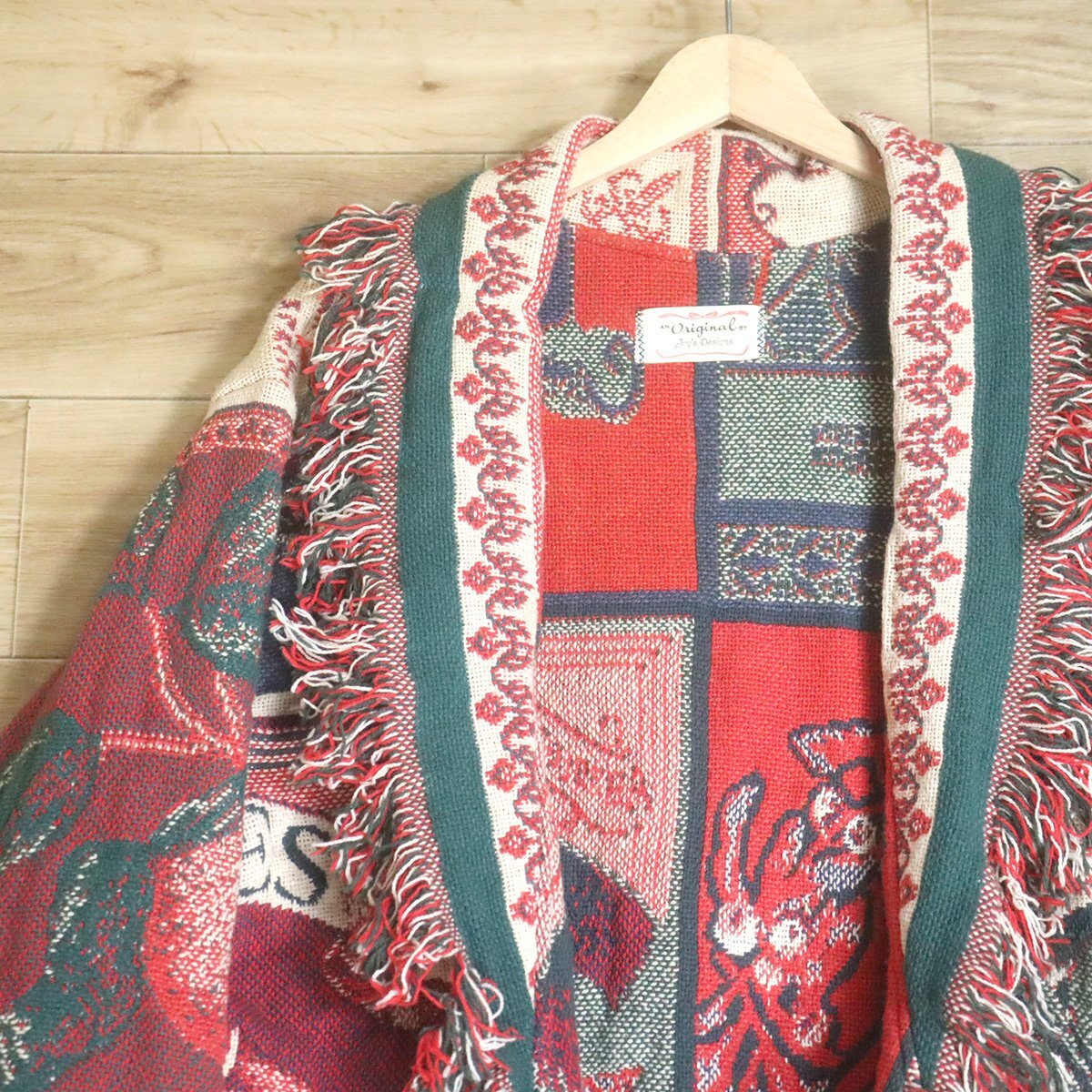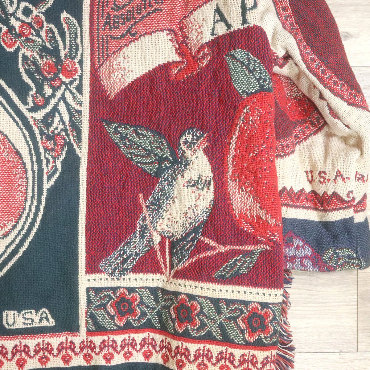 #1T/D11.24-2 ビンテージ JOY'S DESIGN ゴブラン ラグ ジャケット ガウン 鳥 フルーツ柄 ポンチョ 総柄 クレイジー