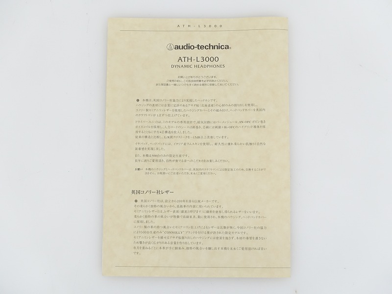 ■メーカー : audio-technica ■型番 : ATH-L3000 【商品の状態 当店での確認内容】 基本動作確認済み 「商品の状態」に関しましては当方主観の目安となります。外観などは中古品で個人差もありますので詳細は画像にてご判断ください。 画像にて不明な点はご質問下さい。 出品商品は画像のものですべてになります。画像に写っているもの以外は付属いたしません。 【送料 全国一律 1,580 円 沖縄、離島は別途お見積り】 ※送料がお得になるサービスです(下取りシステムのご案内です) ストア決済利用時にクレジットカードやPayPay残高/PayPayクレジットを利用の方は留意点がございますのでこちらを参照上ご利用ください。 当ストアでは商品を安全にお届け出来るよう提携運送会社と協議の上、発泡緩衝材や強度段ボールの使用等 運送会社が指定する梱包方法や資材を採用しております。 より安全にお届け出来るよう商品仕様により梱包サイズが大きくなる場合や個口数が増える事がございます。 【当ストアオークションルールを入札前に必ずご確認ください。】 【落札後の取引手順】 ・落札後は取引ナビにて、必要事項をご入力後、送信ください。 取引終了後48時間(土、日は除く)以内に入力をお願い致します。 ※ご連絡が頂けない場合は落札者様都合でのキャンセルとさせていただきます。 ・落札代金(商品代金+消費税+送料)の入金をお願い致します。 ※大型商品の場合は送料確定後の決済となる為取引ナビを入力頂き、当ストアより送料のご案内が来るまでお待ちください。(土曜、日曜、祝日の場合は翌営業日より順次ご案内いたします) ・お支払い方法はクレジットカード/PayPay残高/PayPayクレジット/PayPay銀行/ゆうちょ銀行のみです。 ※商品代金引換(代引き)のお取り扱いはしておりません。 ※領収証の発行が必要な方はご連絡ください。 ※銀行振込の際の振込手数料はご負担願います。 ・入金確認後に出荷手配を致します。 (原則入金確認後3営業日以内に発送いたしますが、大型や重量のある製品はお時間をいただく場合もございます。) ・発送は当店指定の運送会社の元払いのみでの発送となります。 ※他の運送会社、送料代引き等は致しかねます。 ※落札者様ご自身での運送会社の手配いただく事も可能ですが荷物事故の責任の所在の問題上、梱包は致しかねます。 ※店頭にお越し頂き手渡しも可能(福岡市早良区)です。ご希望の方はご落札後にご連絡下さい。 ・大型/重量物商品の送料につきましては商品の特性上、荷降ろし状況等により送料が大きく前後し運送業者に別途見積りが必要な為、早めのお問い合わせにてお見積り上、入札をお願い致します。 【初期不良の保証について】 ・商品到着後の初期動作不良、また配送中の事故による破損、不具合が有る場合は、商品発送後10日以内に当ストアまでご連絡ください。当ストアでは修理での対応を優先させて頂きますが、修理不可の場合は全額返金させて頂きます。 (商品代金+消費税+送料のお支払い頂いた金額となります) 【初期不良の保証の対象外について】 次の場合は保証の対象外となりますのご留意ください ・ジャンク商品、現状商品、難あり商品での出品商品。 ※難あり商品に関しましては動作確認時に一部動作不良が確認された商品になり、記載している動作確認以外にも、動作不良がある可能性もございます。こちらに関しましても保証対象外となりますことをご理解ください。 ・年代物のオーディオなどで、当店にてわからない範囲で部品が交換されている場合 ・楽器類の特殊機材(マイクロスコープ等)での確認までは行っておりません。気になる方は事前にご質問いただくか、入札をお控えください。 ※初期不良に関しましては【商品の状態】に記載のもの、またそれによって起因する動作不良は対象外です。 ※商品発送後10日を過ぎてのご連絡は対応が出来ませんので、商品が到着しましたらお早めに確認をお願い致します。 【メーカー保証の加入・継承】 ・未使用品、展示品やメーカー保証期間が残っている商品に関しまして、メーカー保証の加入、継承が必要な方は、落札後取引ナビ内にて当ストアにお知らせください。商品発送までにご連絡いただけない場合、メーカー保証の手続きを承れない場合があります。 【評価について】 ・評価不要の場合、必ず取引ナビの「要望欄」にてお知らせください。それ以外でご連絡をいただいた場合、対応できない可能性がございます。一度行った評価はシステム上取り消しが行えませんのでご了承ください。 【入札削除・キャンセルについて】 ・入札後はトラブル防止の為いかなる事情がおきましても入札を削除等は致しておりません。 ご検討の上入札をお願い致します。間違った際の入札額の金額訂正はご自身で行ってください。 入札額の変更方法 【入札に関しての注意事項】 ・最近イタズラ入札が多く見られるため、新規IDや悪い評価が一定数あるIDからの入札は当店の判断により取り消しを