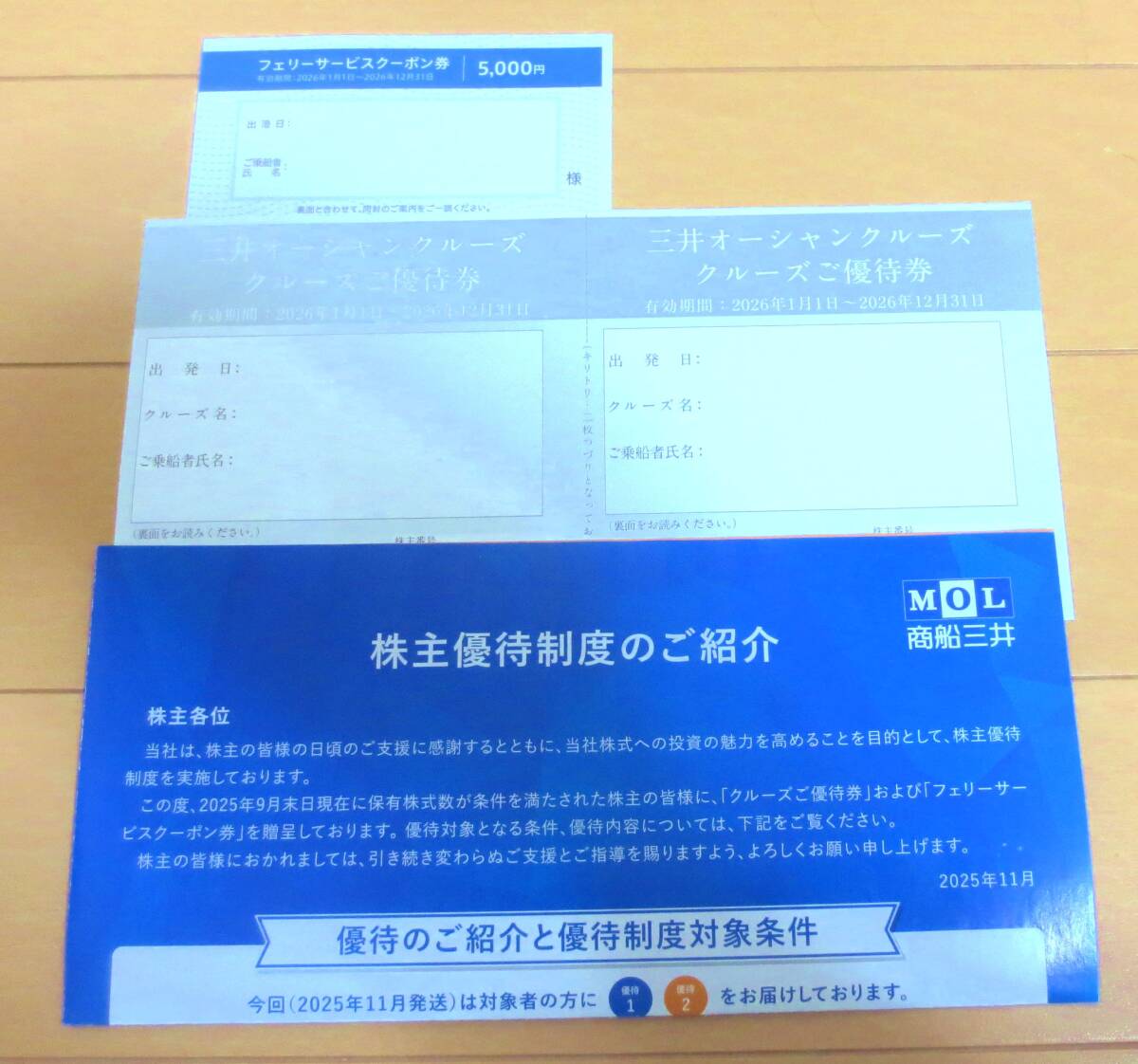 商船三井のクルーズ優待券、有効期限2026年12月31日まで。 - 券種: 優待券 - 有効期限: 2026年12月31日 - 発行元: 商船三井 - 対象商品: クルーズ優待券 ご覧いただきありがとうございます。