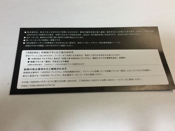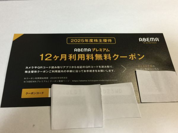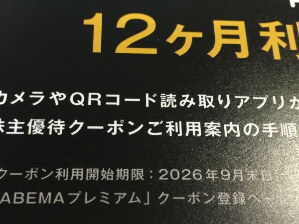ABEMA プレミアム サイバーエージェント 株主優待 12ヶ月 利用料無料 クーポン 1枚 利用開始期限2026年9月末日 ②