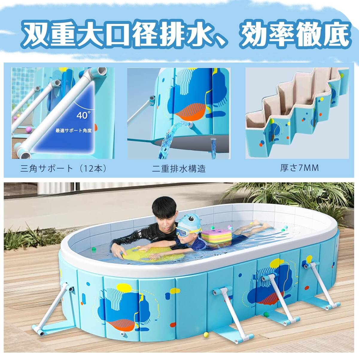 【水漏れ防止・安定した三角構造】厚さ7mmの高強度5層コンポジットでを使用し、底面には3mmの高品質PVC素材を使用しているので、耐摩耗性と耐パンク性、水漏れを防ぎ、従来のインフレータブルプールに比べて3倍以上長持ちします。側面には安定した三角形の支持板を使用し、プールの圧力や変形に強くなっているので、夏の水遊びも楽しくできます!