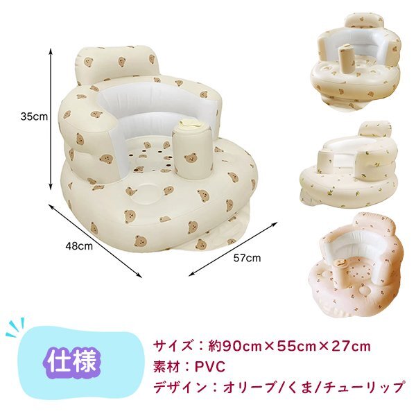ご購入されましたらご希望のデザインをオーダーフォームにてご連絡ください。 ・オリーブ ★在庫切れ ・くま ・チューリップ 空気で膨らませるベビーチェア!赤ちゃんに快適な時間をプレゼント ★ポンプ一体型で簡単準備 本体に内蔵された空気入れポンプを使って、手動で簡単に空気を注入できます。 3~4分ほどでセット完了!使わないときは折りたたんでコンパクトに収納可能。 持ち運びもラクラクです。 ★どこでも大活躍! おうちではもちろん、実家や旅行先、ピクニックなどでも便利に使える万能チェア。 軽量設計で、赤ちゃんの離乳食タイムやおすわり練習、お昼寝中のサポートにもピッタリです。 ★赤ちゃんに優しい素材と安心設計 柔らかいPVCソフト素材で、赤ちゃんの体を優しくサポート。 底部は安定感のある滑り止め加工付きで、安全面も安心です。 ★プレゼントにも最適 可愛い韓国風のデザインとおしゃれなカラーは、赤ちゃんとママの心をくすぐります。 初めての離乳食やおすわりを応援するギフトとしてもおすすめです! 【対象年齢】 6ヶ月~3歳 ※お子様の成長に合わせて、保護者の方が使用可能かご判断をお願い致します。 【サイズ】 約48cm×57cm×35cm ※素材と製造工程から生じる個体差のため、表記のサイズと実際のサイズが多少異なる場合があります。 【デザイン】 ・オリーブ ・くま ・チューリップ |