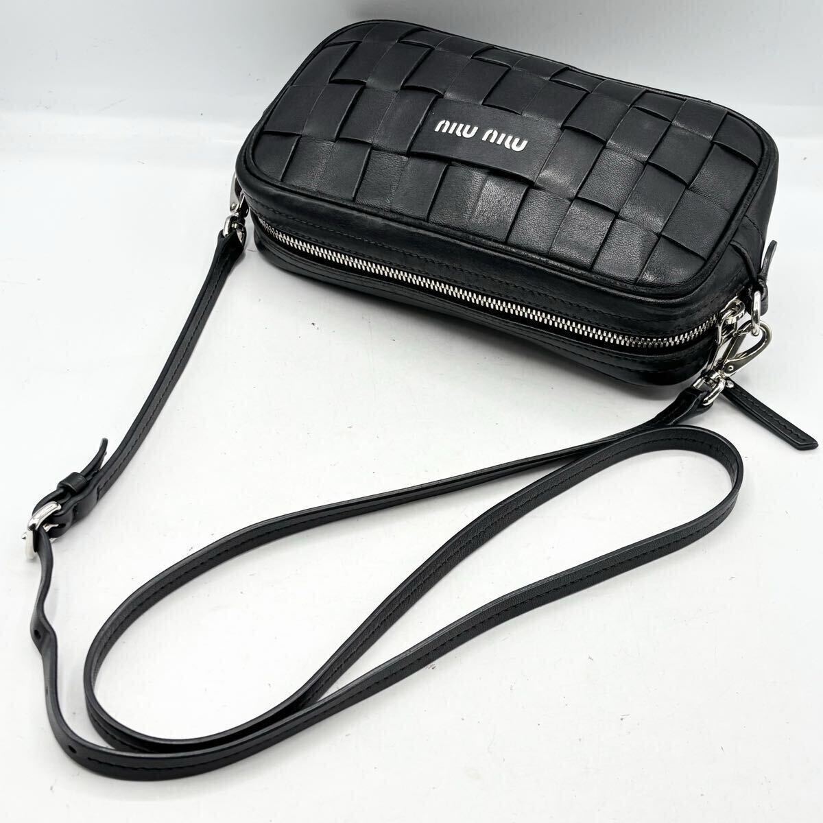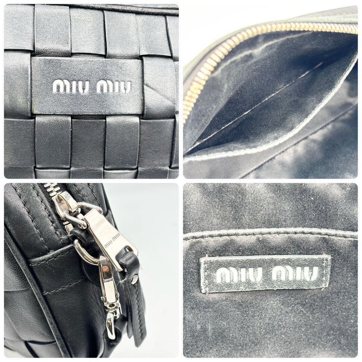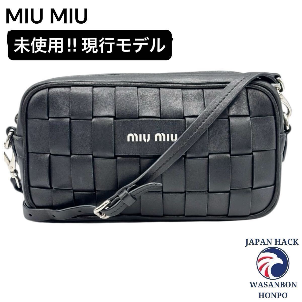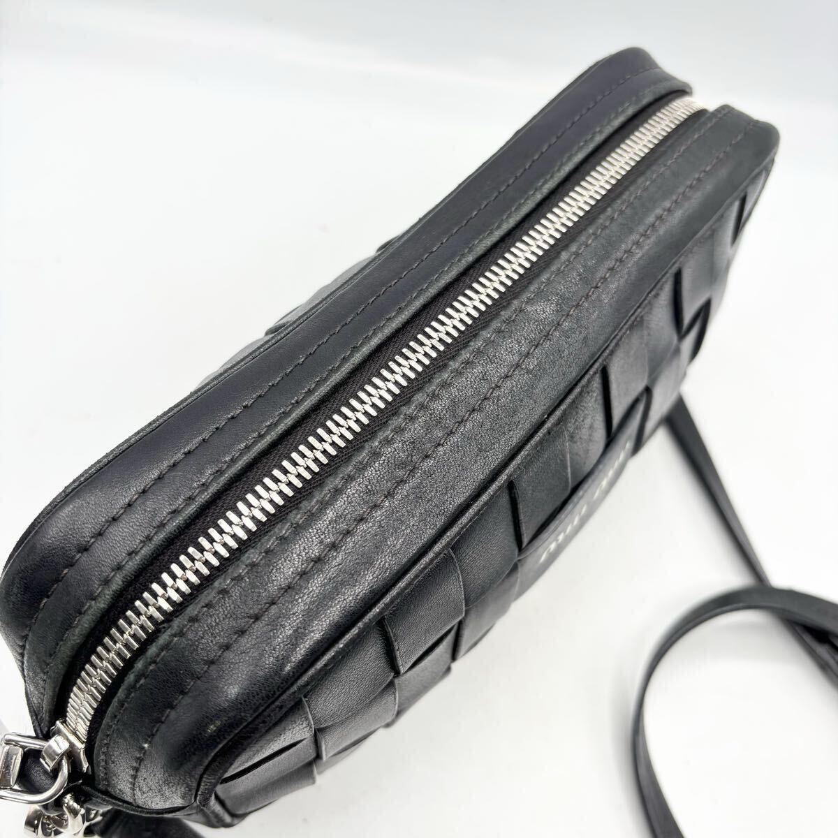 現行モデルのミュウミュウ(miu miu)のクロスボディバッグ、未使用品です。上質な編み込みレザー(イントレチャート)が特徴的で、ブラックにシルバー金具が映えるスタイリッシュなデザイン。財布やスマートフォンなどの必需品が収まるサイズ感で、デイリーユースに最適です。