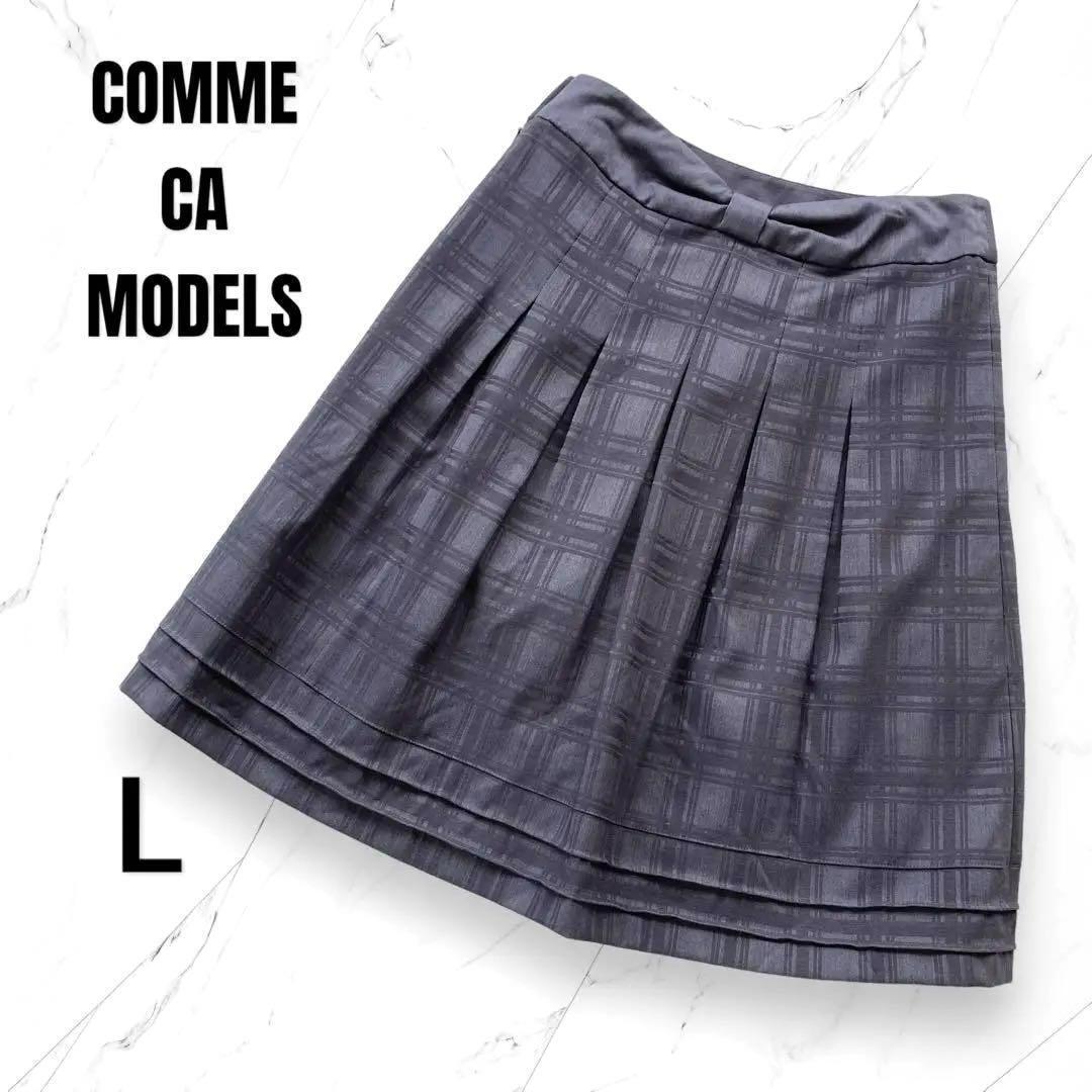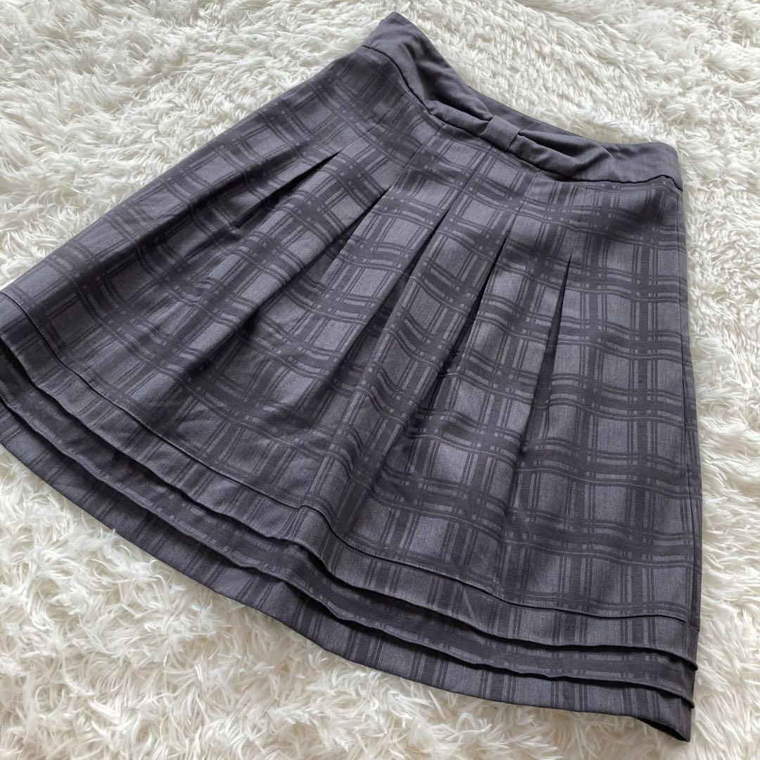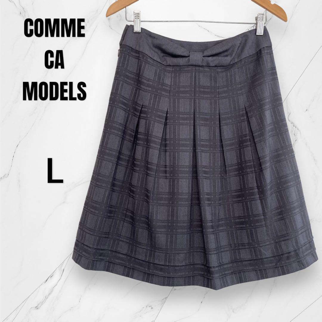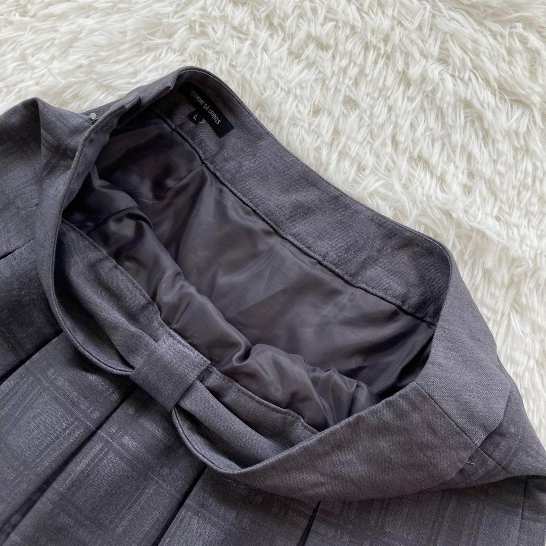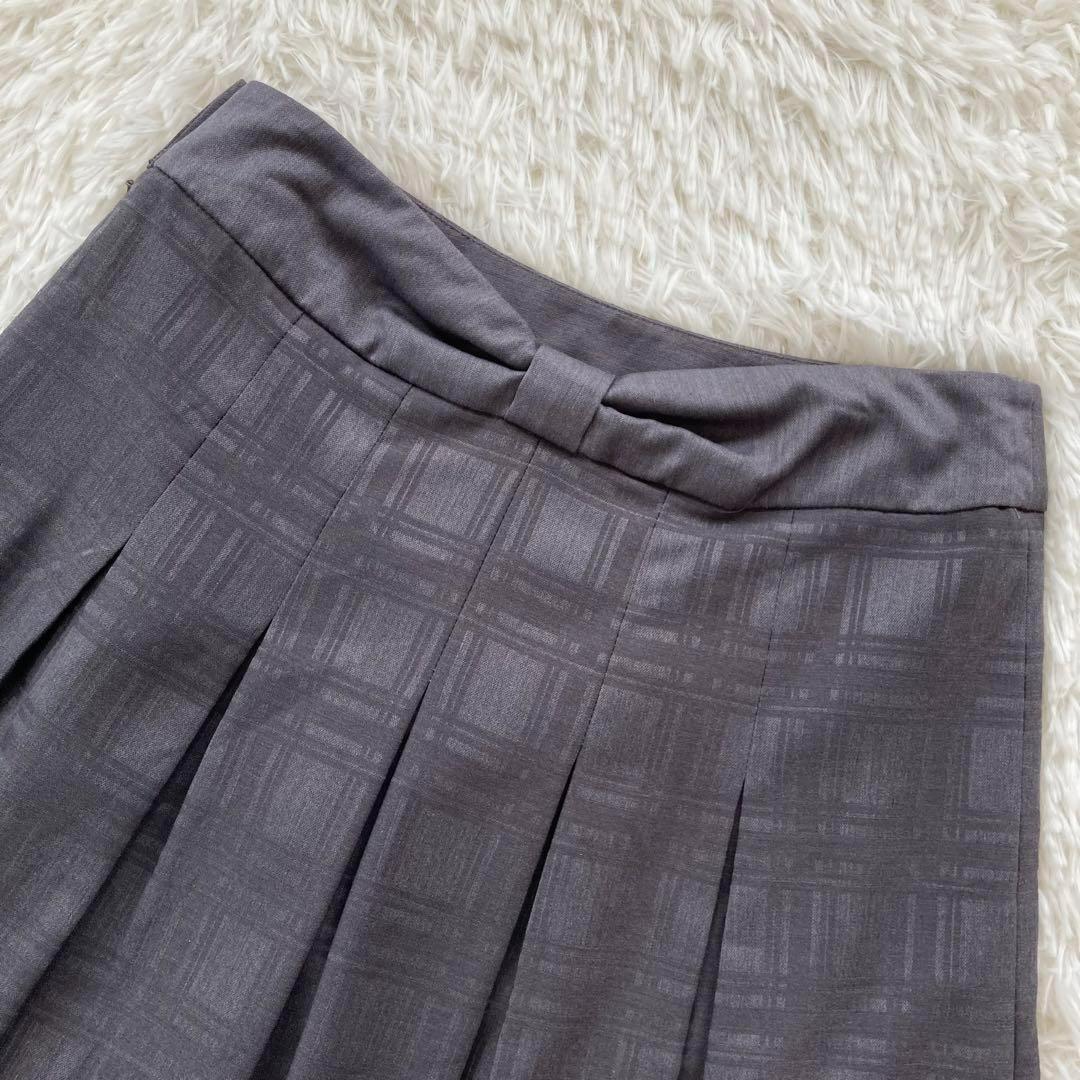 【コムサモデルズ】リボンデザイン チェック柄ボックスプリーツスカート グレー L 164B8E