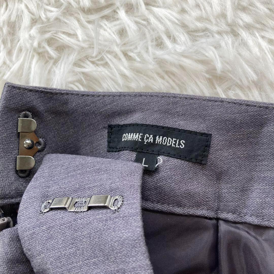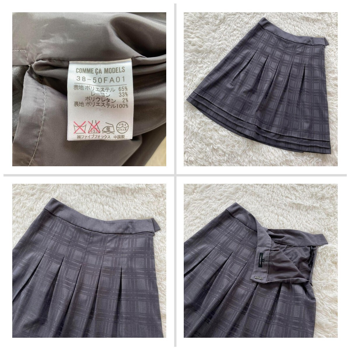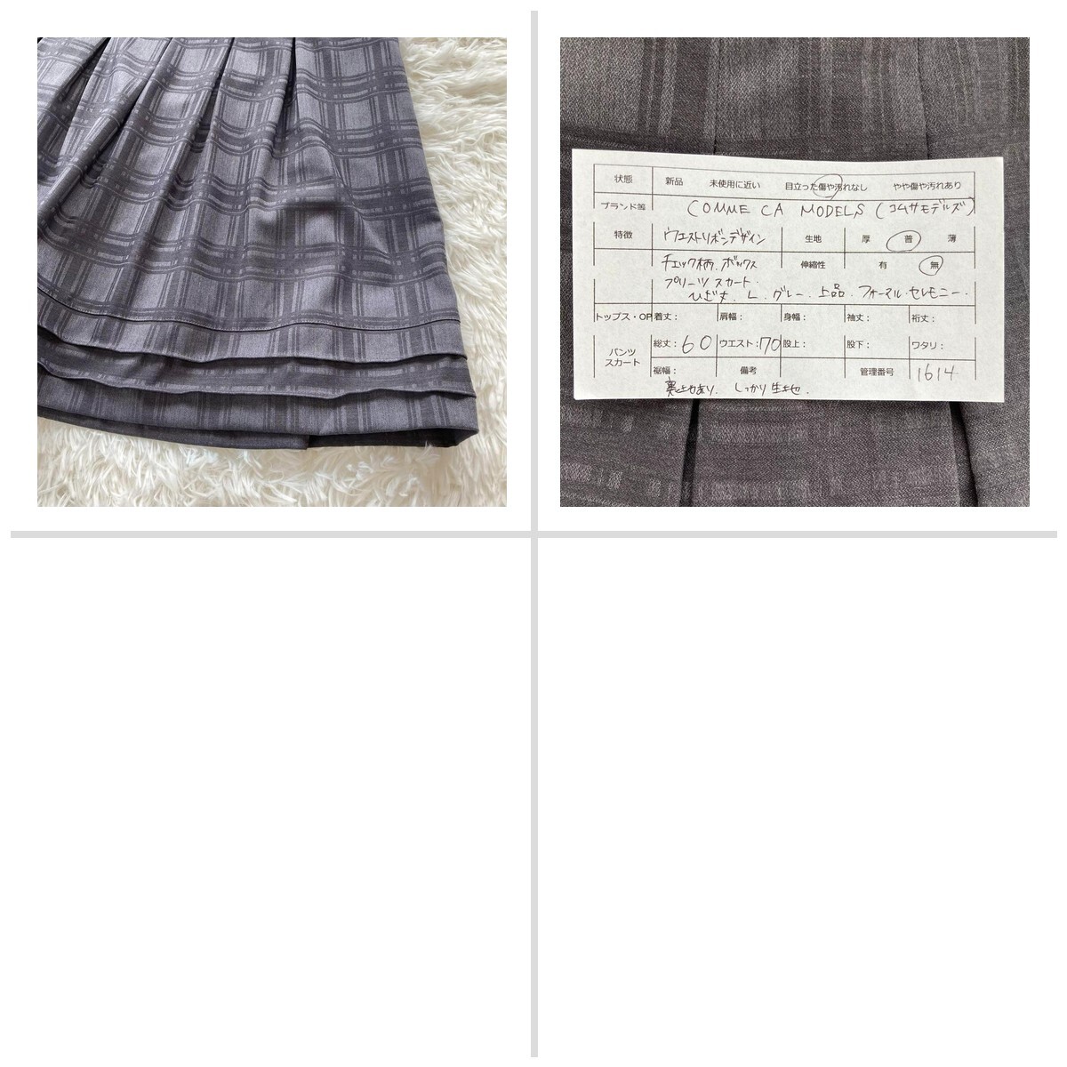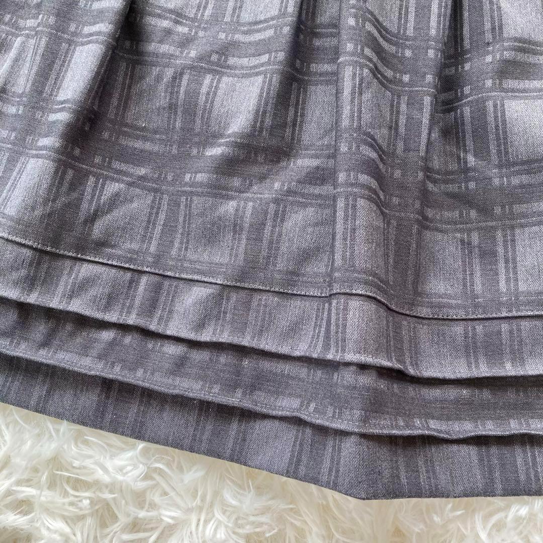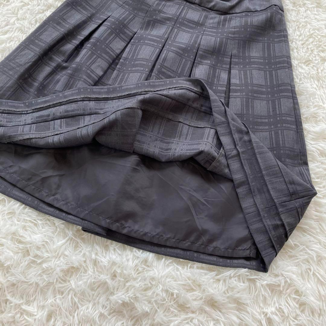 【コムサモデルズ】リボンデザイン チェック柄ボックスプリーツスカート グレー L 164B8E