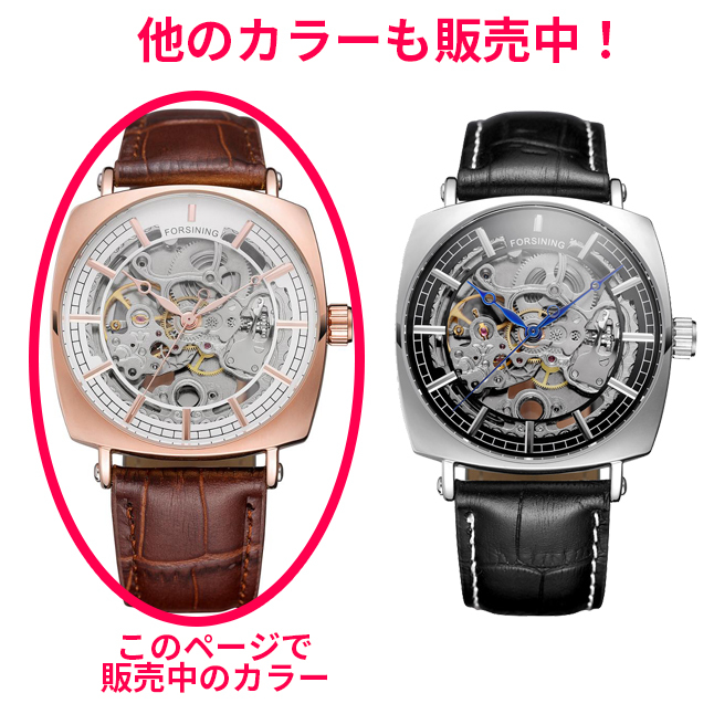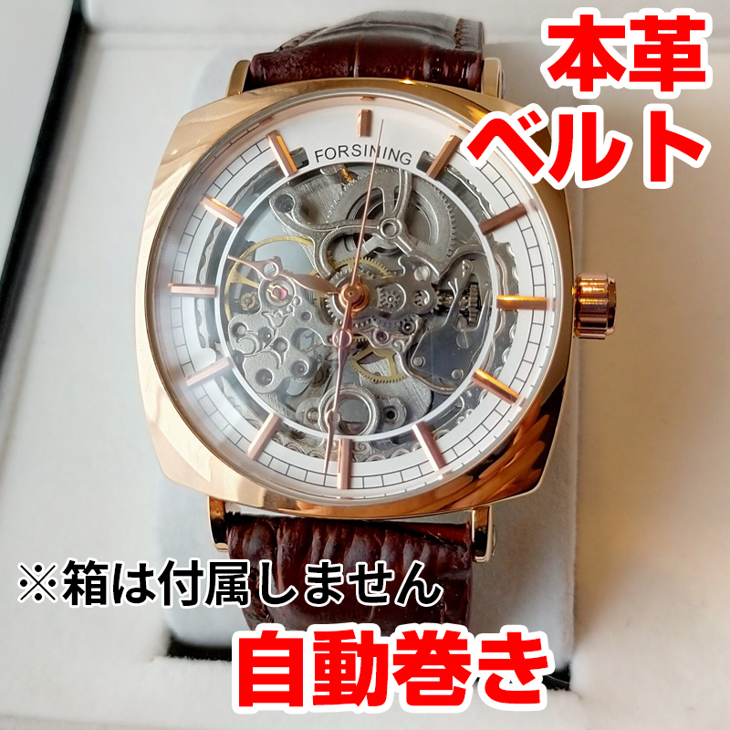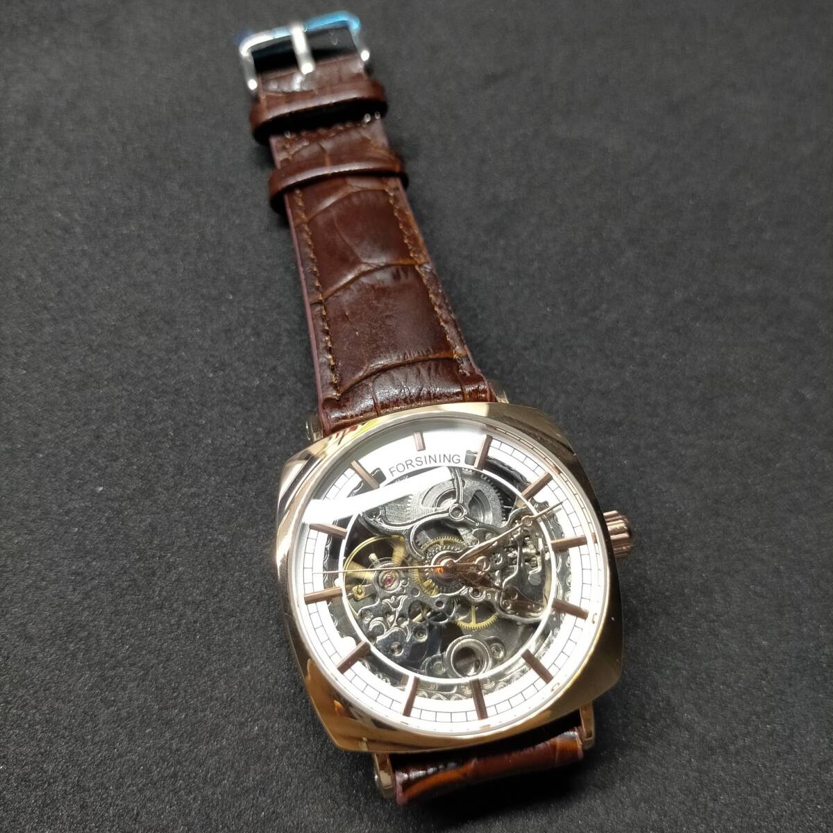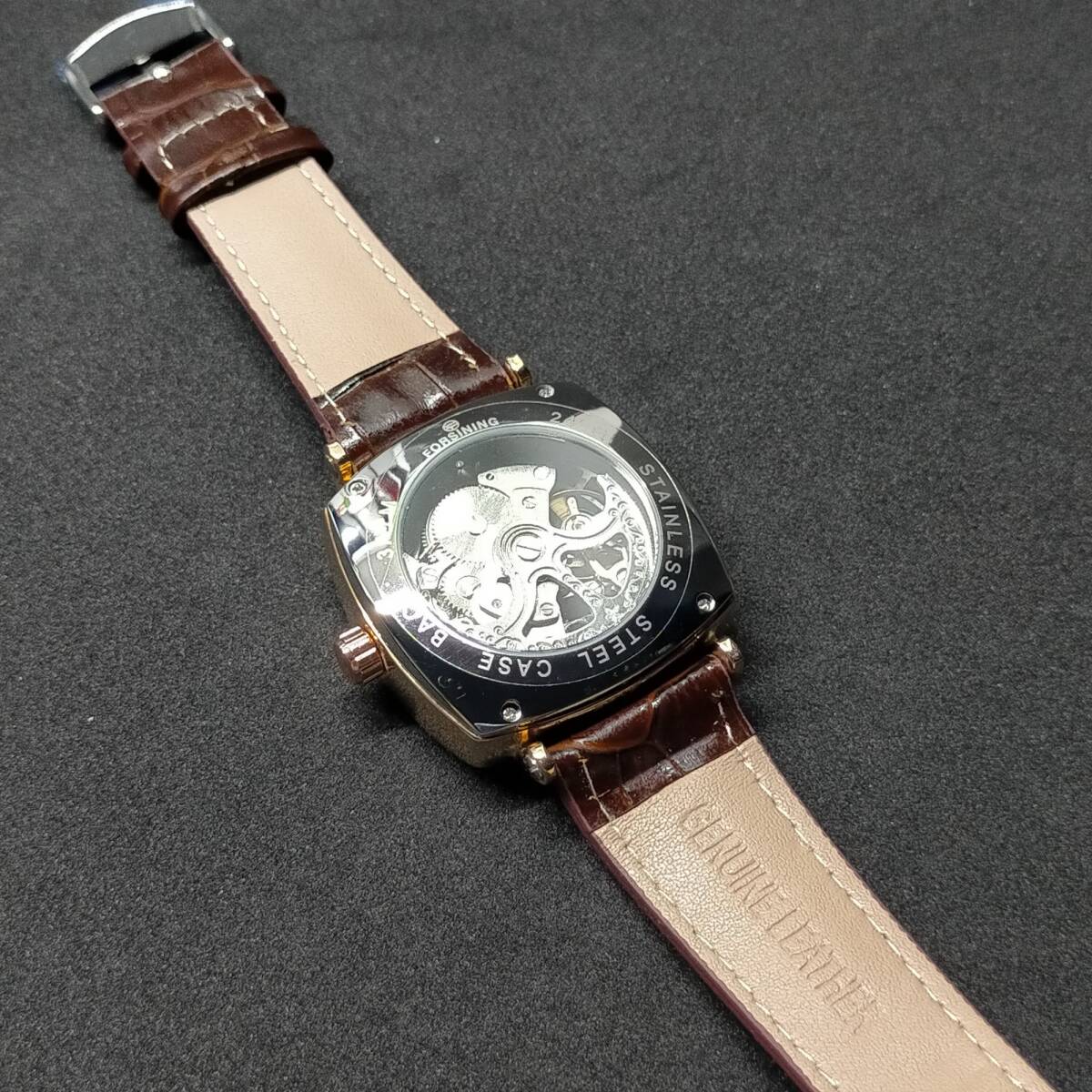Forsining社メンズ腕時計自動巻き 角型 防水 ブラウン茶色本革レザーベルト ゴールドxホワイト