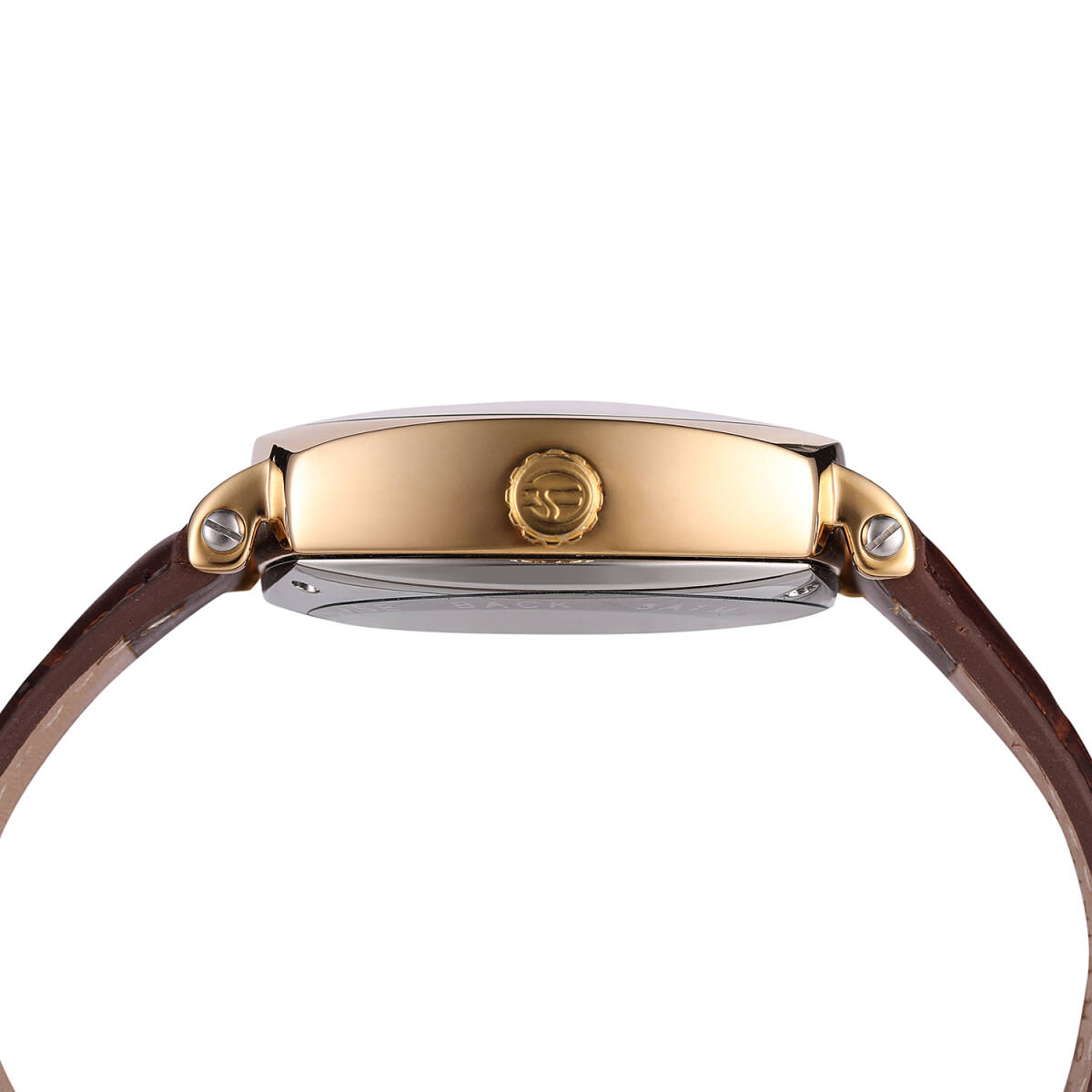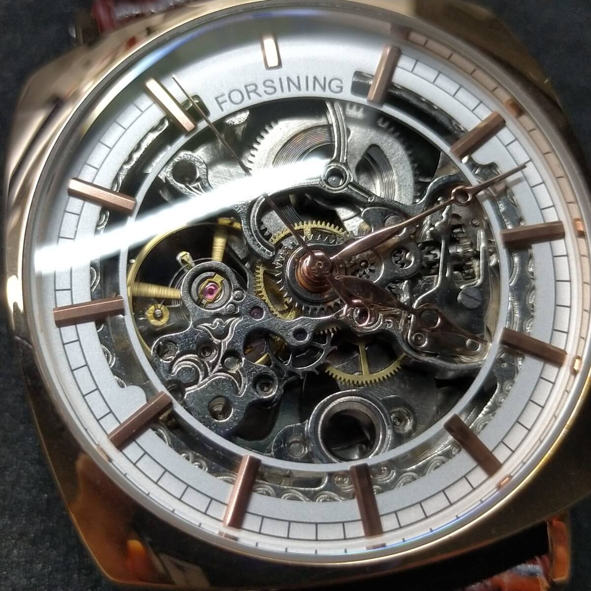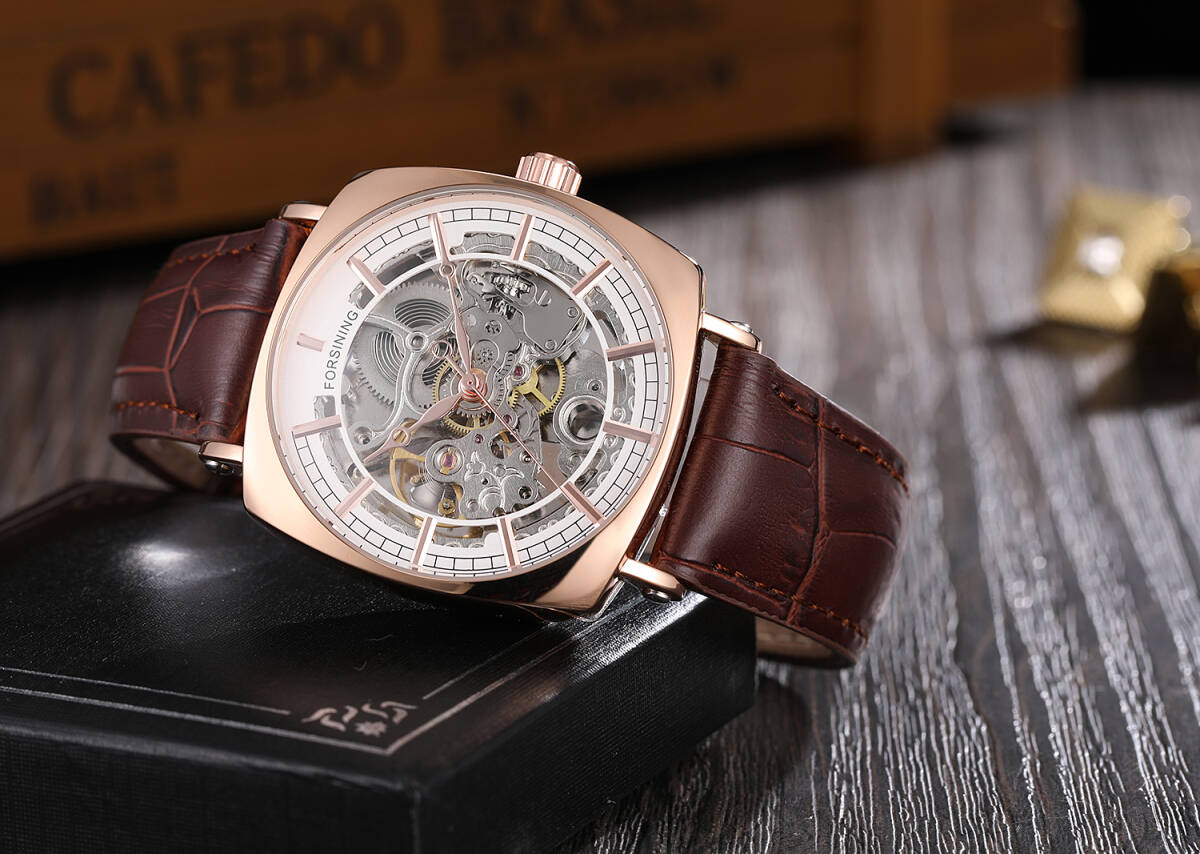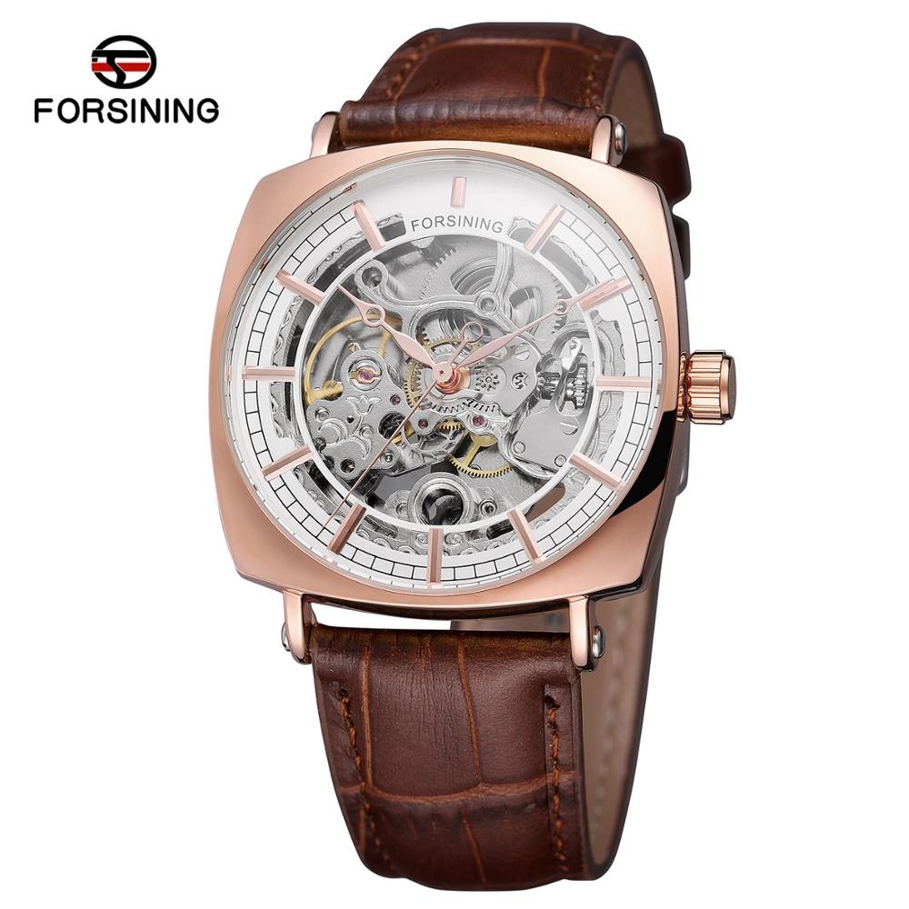 Forsining社メンズ腕時計自動巻き 角型 防水 ブラウン茶色本革レザーベルト ゴールドxホワイト