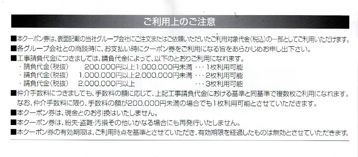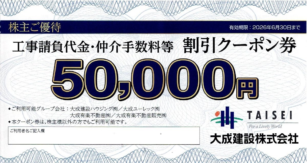 大成建設株主優待 工事請負代金・仲介手数料等 割引クーポン券 50.000円