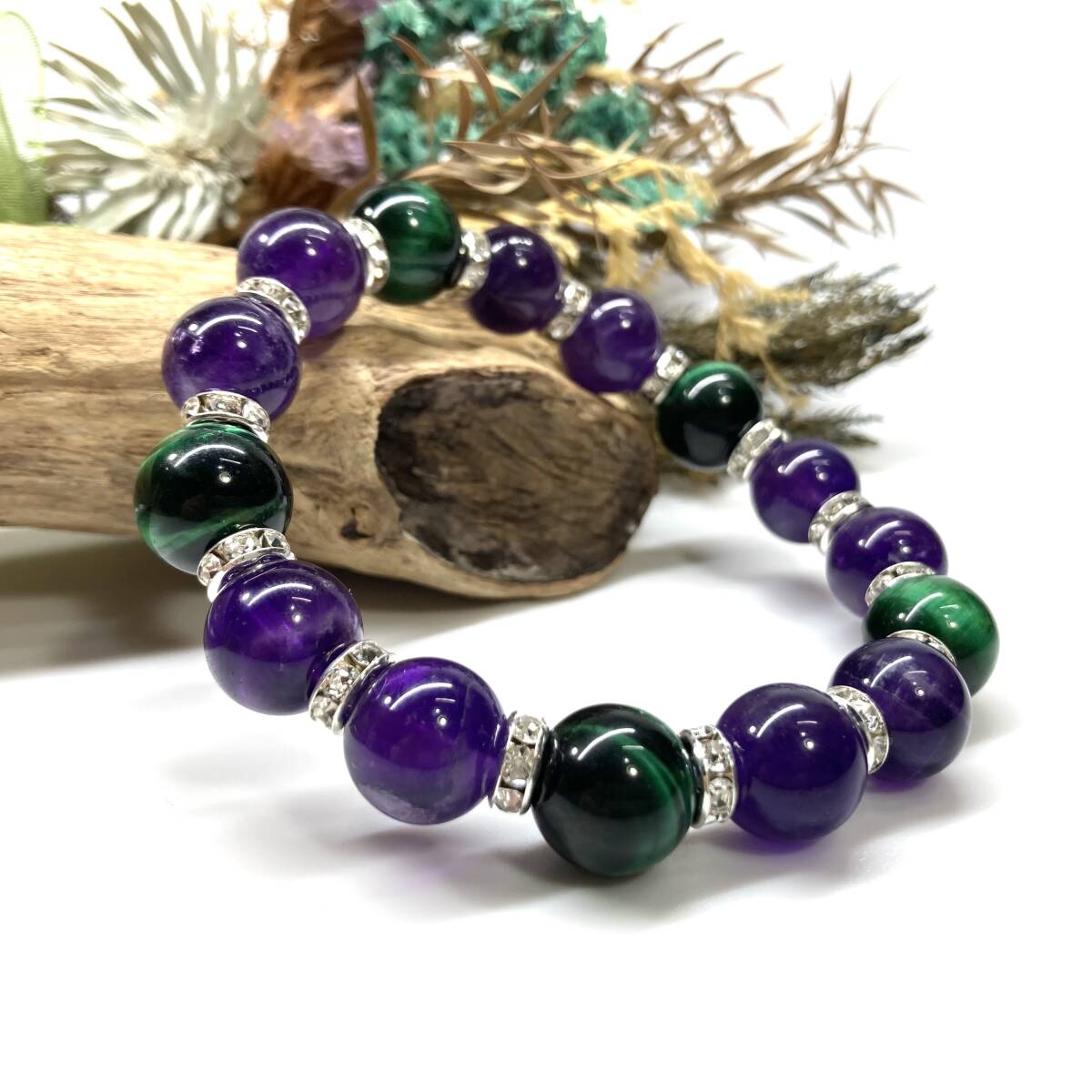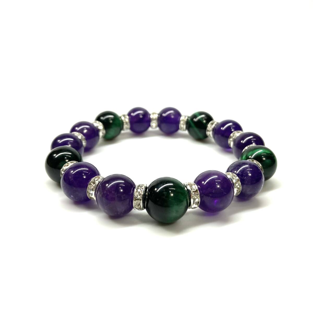こちらは、グリーンタイガーアイとアメジストを組み合わせたパワーストーンブレスレットです。間にはロンデルを挟み高級感あるデザインに仕上げております。石大きさは12mm玉を使用して内周約18cmです。気になる方は是非この機会にどうぞ。