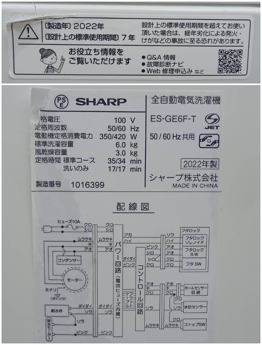 [251202-2T]【中古動作品】≪SHARP/全自動電気洗濯機≫ES-GE6F-T/シャープ/6.0kg/2022年製