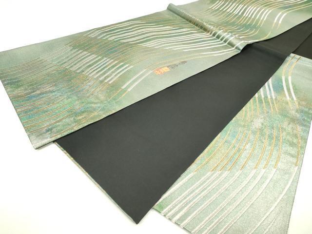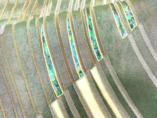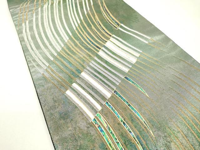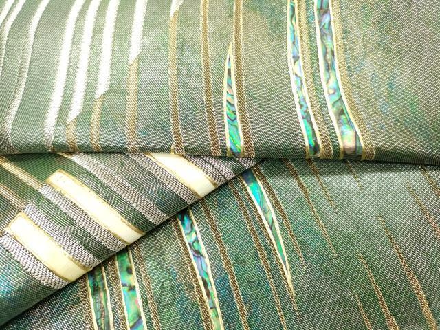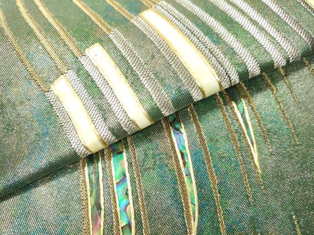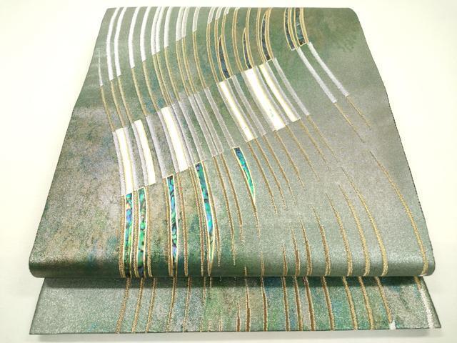 | 【正絹】 状態は1.2回程しか締めておりませんが 接写画像のように太鼓に薄い汚れがございます。 その他特に目立ったシミ汚れなどもなく大変良い状態です。 藤本隆士さんは京友禅に若挟塗りの螺鈿の手法を取り入れた創作作家です。 オパールの輝きのような、神秘的な色彩を宿した素材「螺鈿」。 自然の宝石とも呼べるその螺鈿を用いて創作された、 味わい深く、お洒落なムード漂う作品です。 「螺鈿(らでん)」は、 貝殻の内側の真珠層を薄く切り出して、はめ込む手法です。 奈良時代に唐から螺鈿の技術が輸入されて以来、 真珠層が光線によって、青色やピンク色などの優しい光を放ち、 自然な非規則性が神秘的で日本人の心を惹きつけてきました。 丁寧に、精密に織り出された源氏物語・・・ 実に多彩な彩りは、螺鈿のみ表現できる美しさ 織り螺鈿金細工の染などでは表現できない、 貝殻の持つ自然な光沢がとても美しく、優雅さと華やかさを添えます。 大変上質な逸品になります。 お安く出品致しますので、是非この機会にいかがでしょうか?