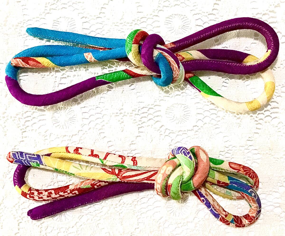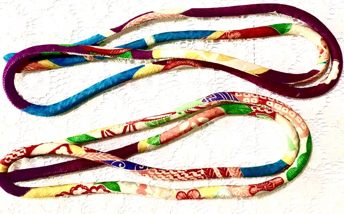 ■時代物の正絹着物地で作った紐です。直径、約3~5mm×長さは、 (紋綸子)約96cm・(紋綸子)約85cm、の2本セット