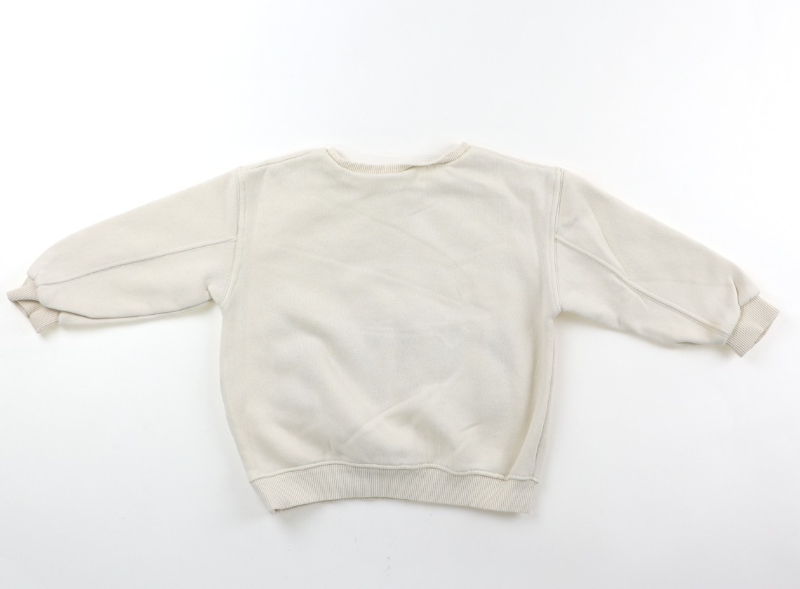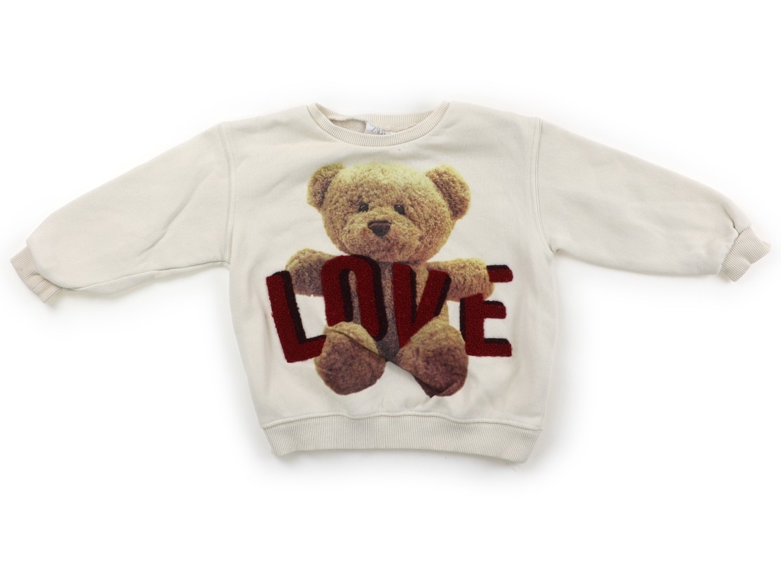 裏起毛トレーナー地。実際のサイズ表記は、104cm。品質タグが切られています。薄いシミがいくつか見られ、毛羽立ち・洗いざらし感があります。