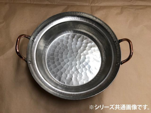 | 熱伝導率が高い銅製です。鍋物の際に欠かせないアイテムです。 ※こちらの商品は手作業で製作しているため、若干のサイズ誤差が生じる場合がございます。予めご了承ください。 【最初にご使用になる前に】 食器用洗剤をつけたスポンジで洗って、水でよく流し完全に乾かします。 その後、鍋7分目を目安に油を入れて火にかけ、弱火で4~5分煮てください。 (鍋から目を離さぬよう注意してください。) こうする事で油が鍋になじみ、焦げ付きを防ぎます。 煮終わった油には不純物が浮き上がる事があるので、完全に冷めてからお捨てください。 【お手入れ方法】 ●鍋が冷めてから、キッチンペーパー等で内側のくずを取り除き、薄く油を引いて収納してください。 ※油が鍋になじみ、一層焦げ付きにくく使い勝手のよい鍋になります。 ※油が気になる場合、又はしばらくご使用にならない場合には軽くスポンジで洗い、次回使用の際に油馴らしをしてください。 ●外側は、食器用洗剤等を使用してスポンジで洗ってください。 ●焦げ付いた場合、鍋に水を入れ火にかけ、沸騰させた後にスポンジで洗って最初に使用するときと同じように油で煮てください。たわし、クレンザーなどでこするのはおやめください。傷つきの原因になり、またその部分が焦げ付きやすくなります。 ●長期間ご使用にならない場合は、油を引いた後にキッチンペーパー等を内側に引き、かぶせておくことにより長持ちします。 【ご使用上の注意】 ●空焚きは絶対にしないでください。 ●銅は熱伝導率が非常に高いため、火力は弱め(中火~中火以下)に調整してください。 ●内側(銀色の部分)は、たわし、クレンザー、金属製の器具をご使用にならないでください。 ●持ち手がゆるんだ状態でのご使用はおやめください。 ●持ち手部分が熱い時には、鍋つかみ等をご使用ください。 ●鍋の中に調理物を長時間保存しますと錆びの原因になりますので、調理後はすぐに調理物を他の器に移してください。 |