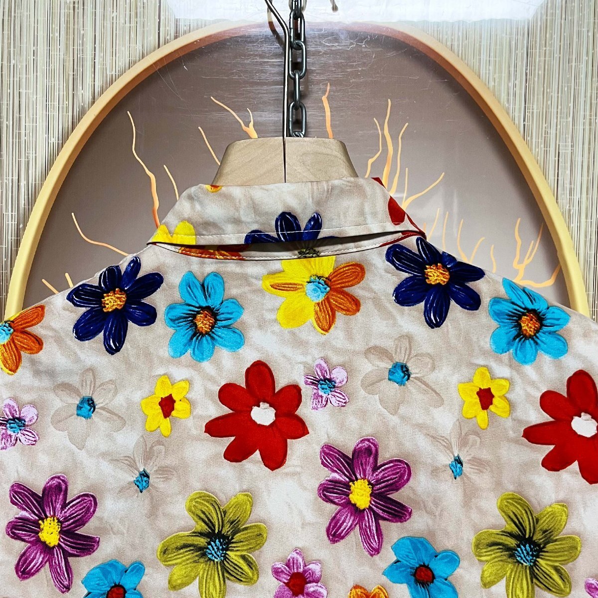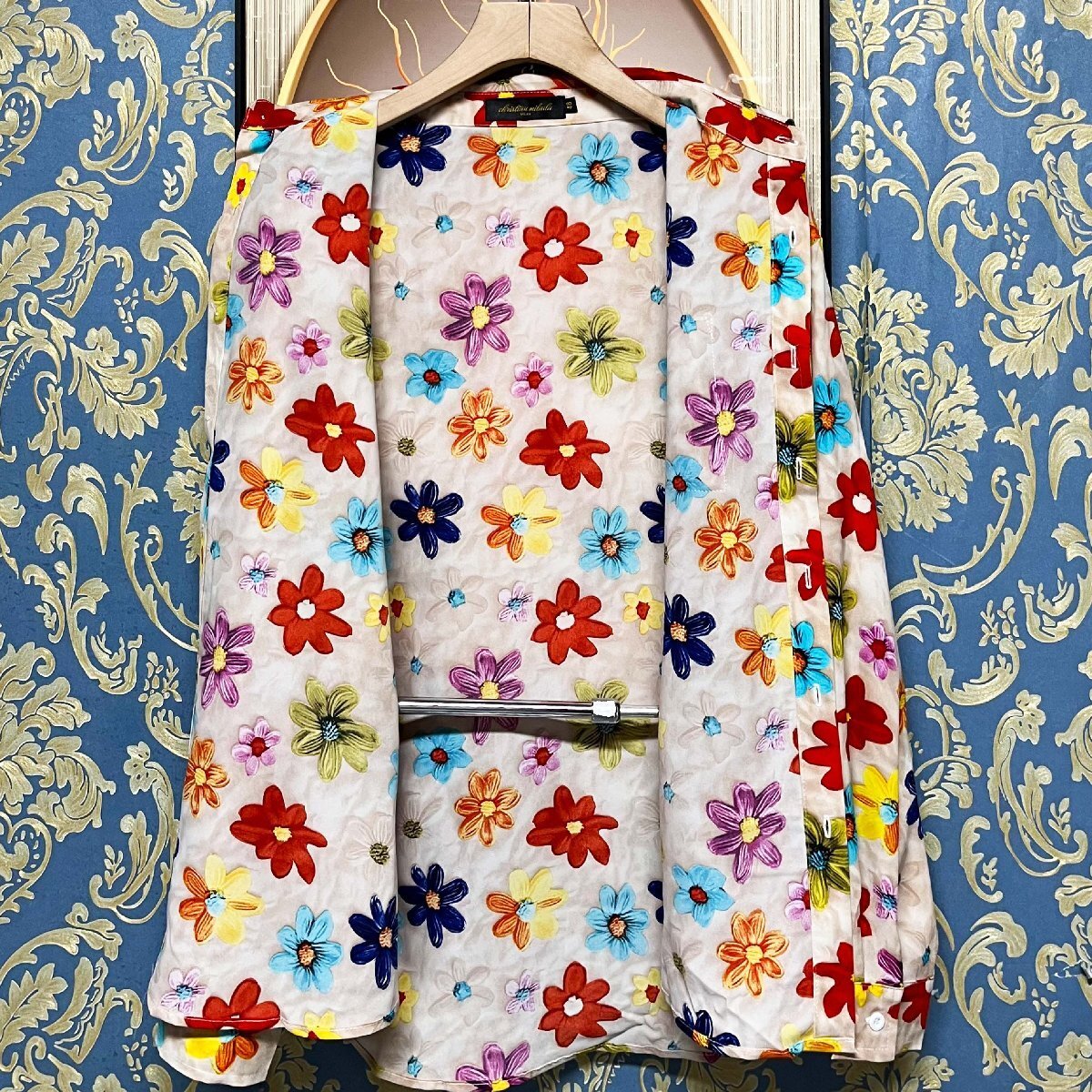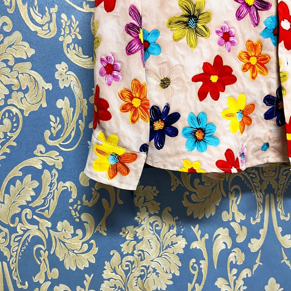 やわらかな色合いに、小さな花々が散りばめられた総柄デザイン。華やかさの中にも控えめな上品さがあり、着るだけで気分が明るくなるような一着です。大人のリラックススタイルにもぴったり。襟はスタンダードなレギュラーカラーで、ジャケットやカーディガンとの相性も抜群。