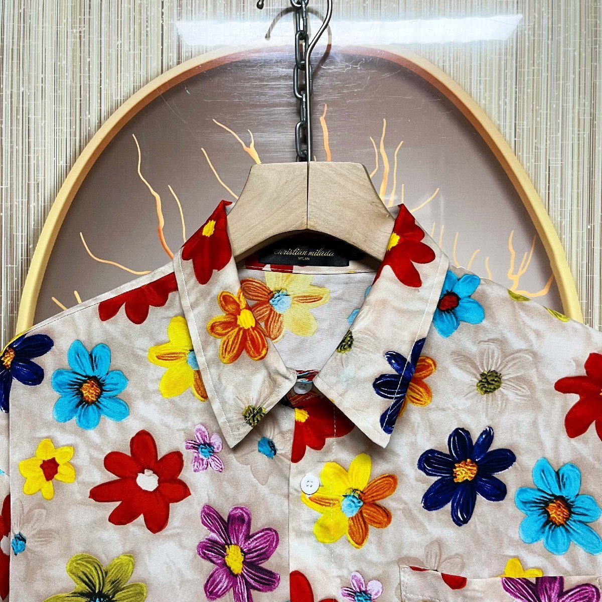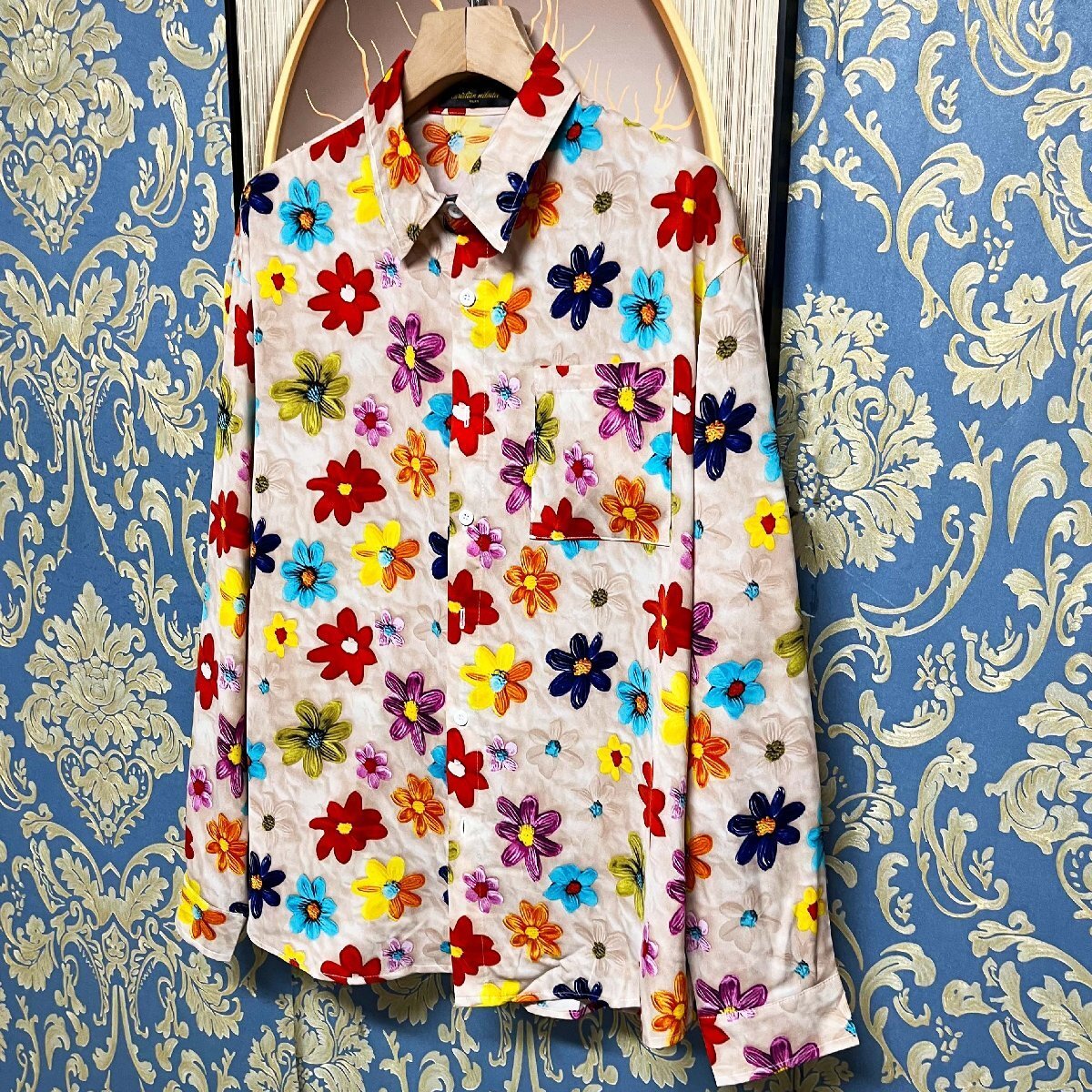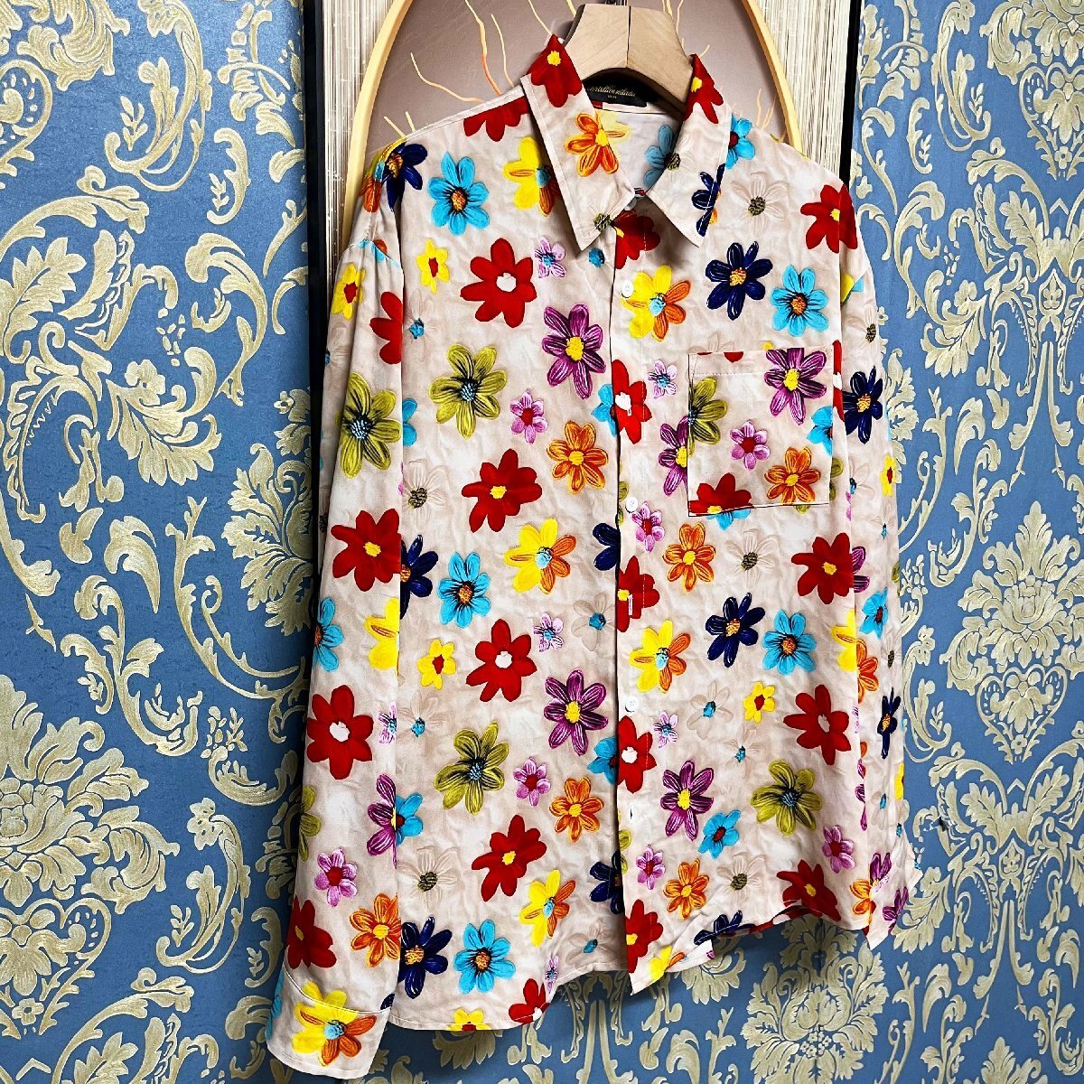 定価4万★christian milada・ミラノ発・長袖 シャツ★高級シルク混 ソフト 滑らか ゆったり 総柄 花柄 折り襟 開襟トップス カジュアル 街着 L/48サイズ