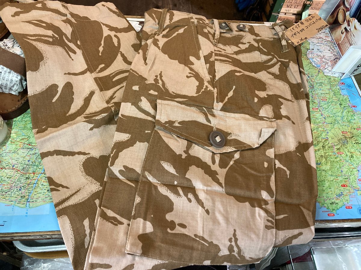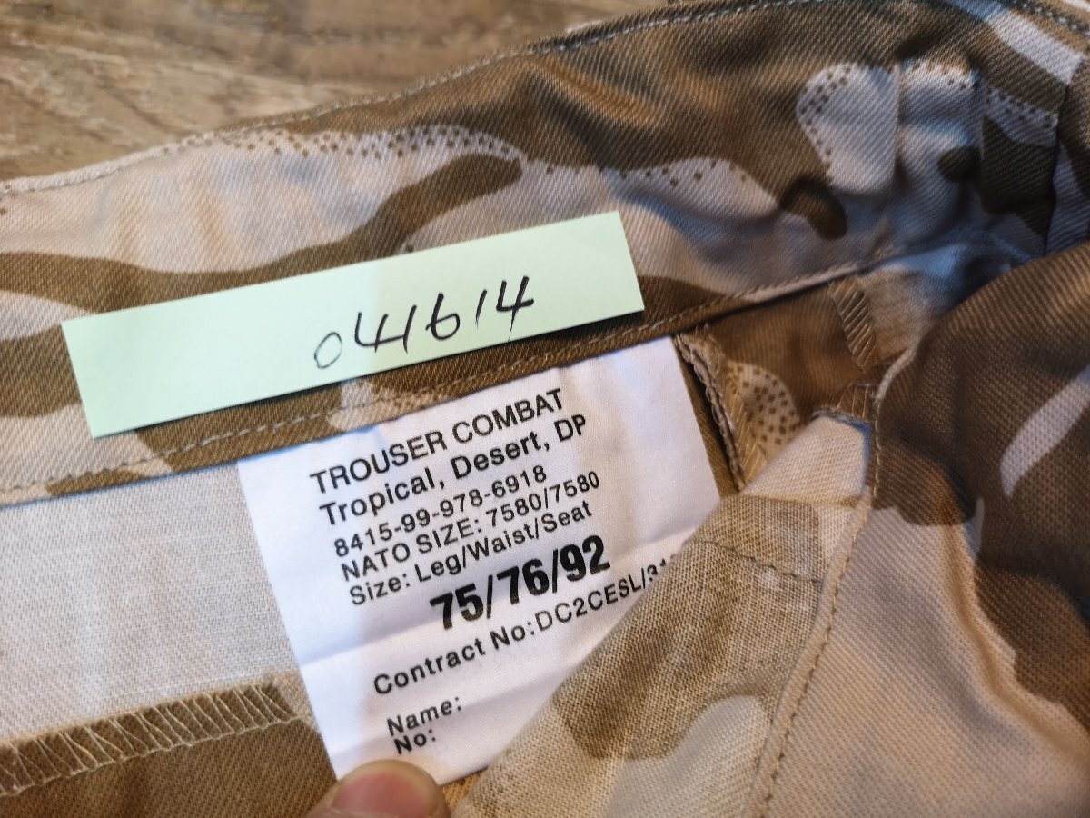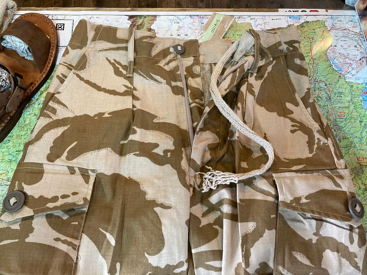 イギリス軍放出の未使用本物。砂漠地方で着用するコンバットパンツ薄手の綿100生地です。 ポケットは前2つ、カーゴポケット2つ、後ろポケットは1つ、フロントフライはジッパータイプ。 ウエスト内側に絞れる様に太目の紐が内蔵されています、さらにウエスト両サイドにサイズ調整ボタンあり。淡いベージューの色合いで街で穿いても違和感ない夏の定番カラー。 イギリスのタグのサイズ表示はレングス/ウエスト/ヒップの順です。 サイズ75/76/92は股下が77センチほど、わたり34cm、裾23cm。太いウエストの紐が入っていますのでベルトなしで十分使用できます、またベルトループは9センチほどの幅があり逆に太いベルトも使用可能です。 沖縄離島を除く全国元払い500円でお送りいたします。落札価格にプラスでお願いします。 最後の写真以外は流用です。