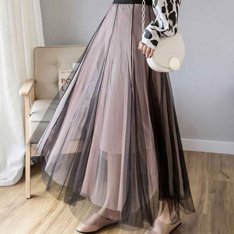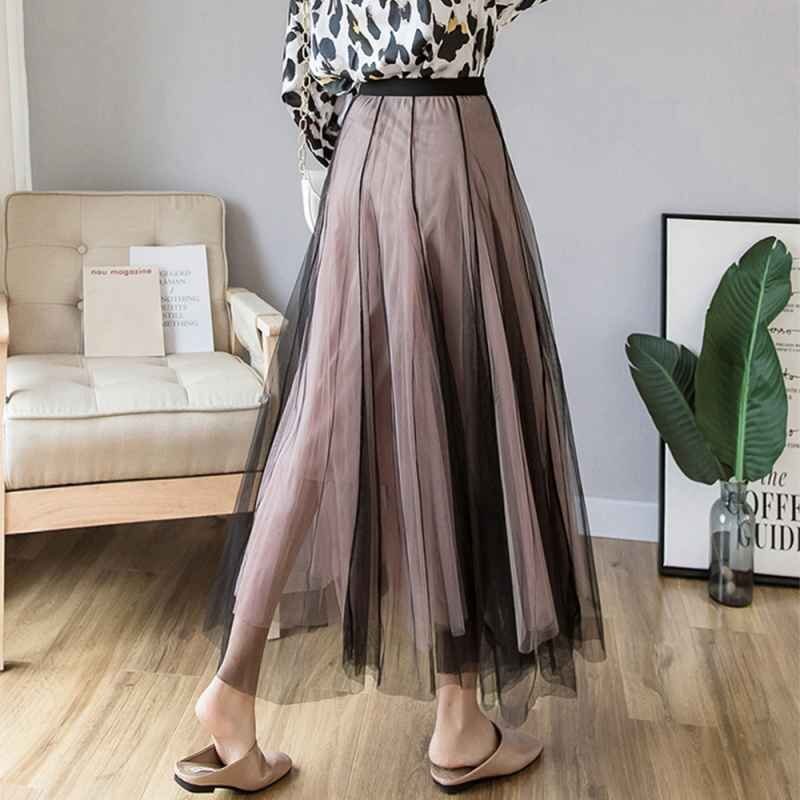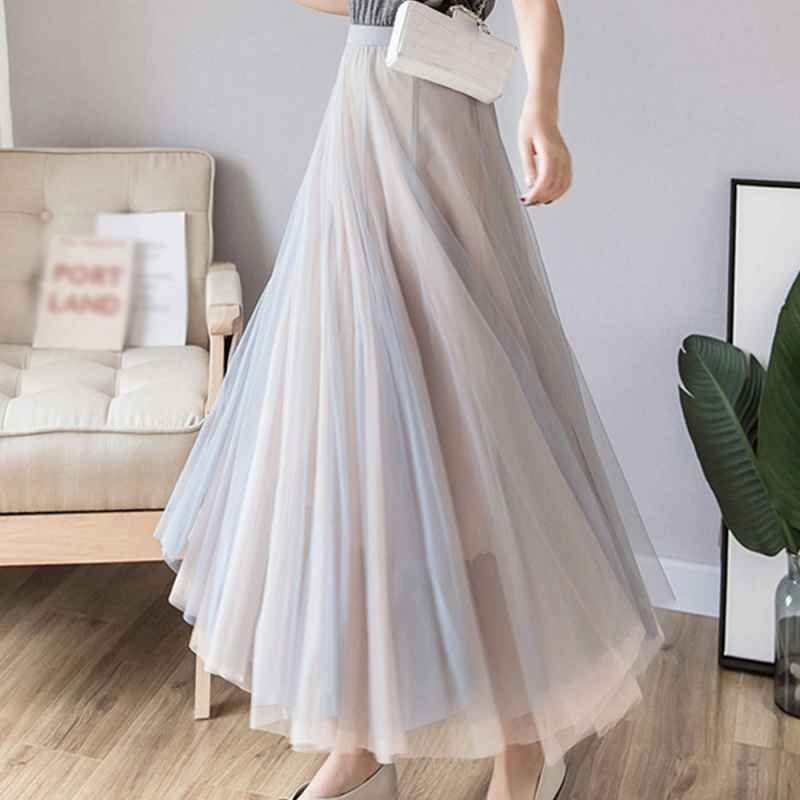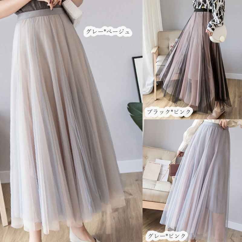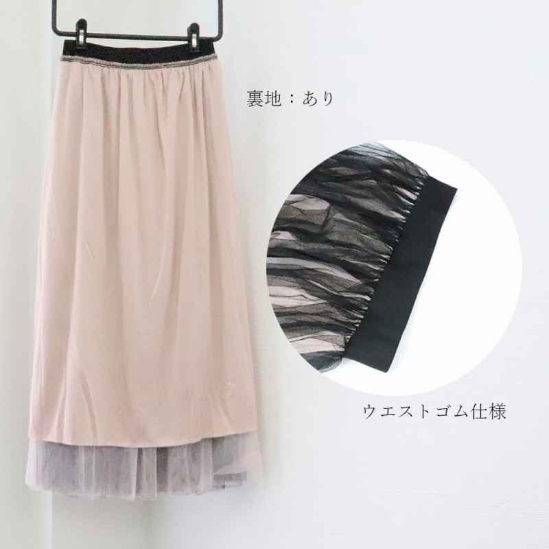 内外バイカラーで重なりを楽しめるデザインのチュールロングスカート