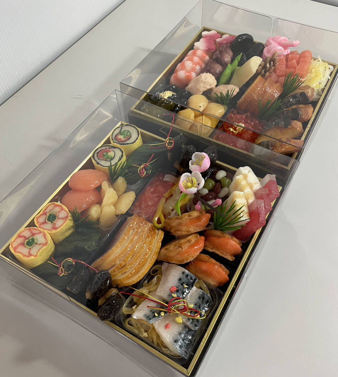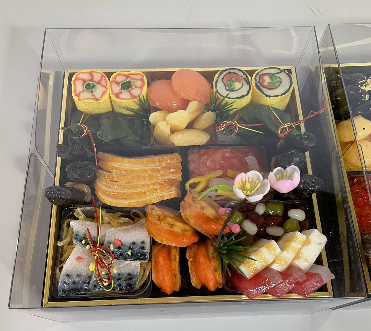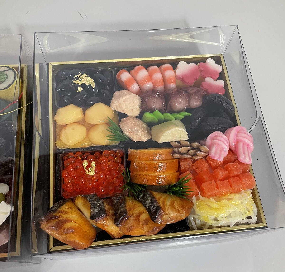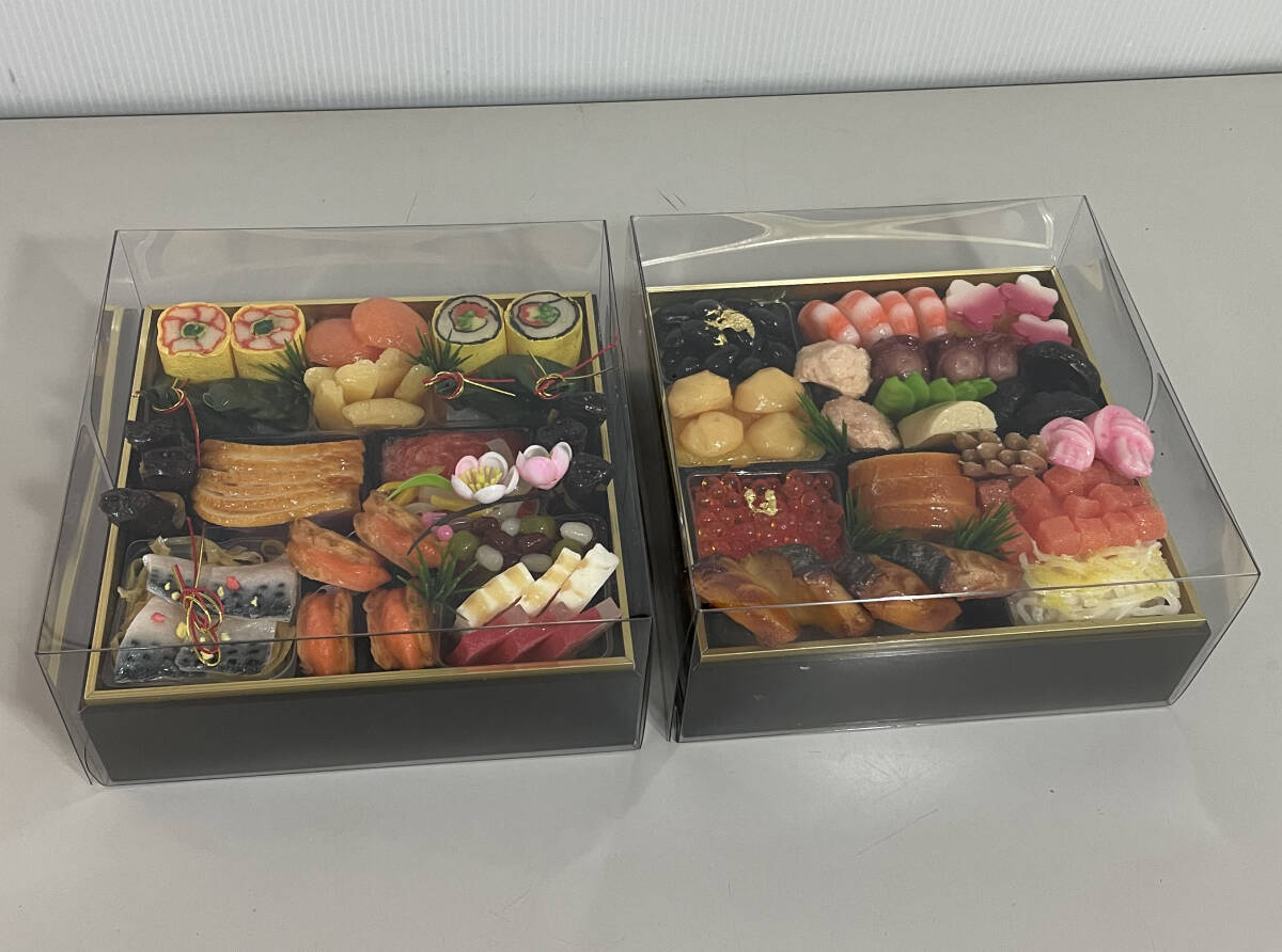 ・希少 非売品!京都料亭 わらびの里 豪華おせち 食品サンプル 2個セット 2万円相当モデル 什器 見本 正月飾り 黒豆 海老(Y12024)