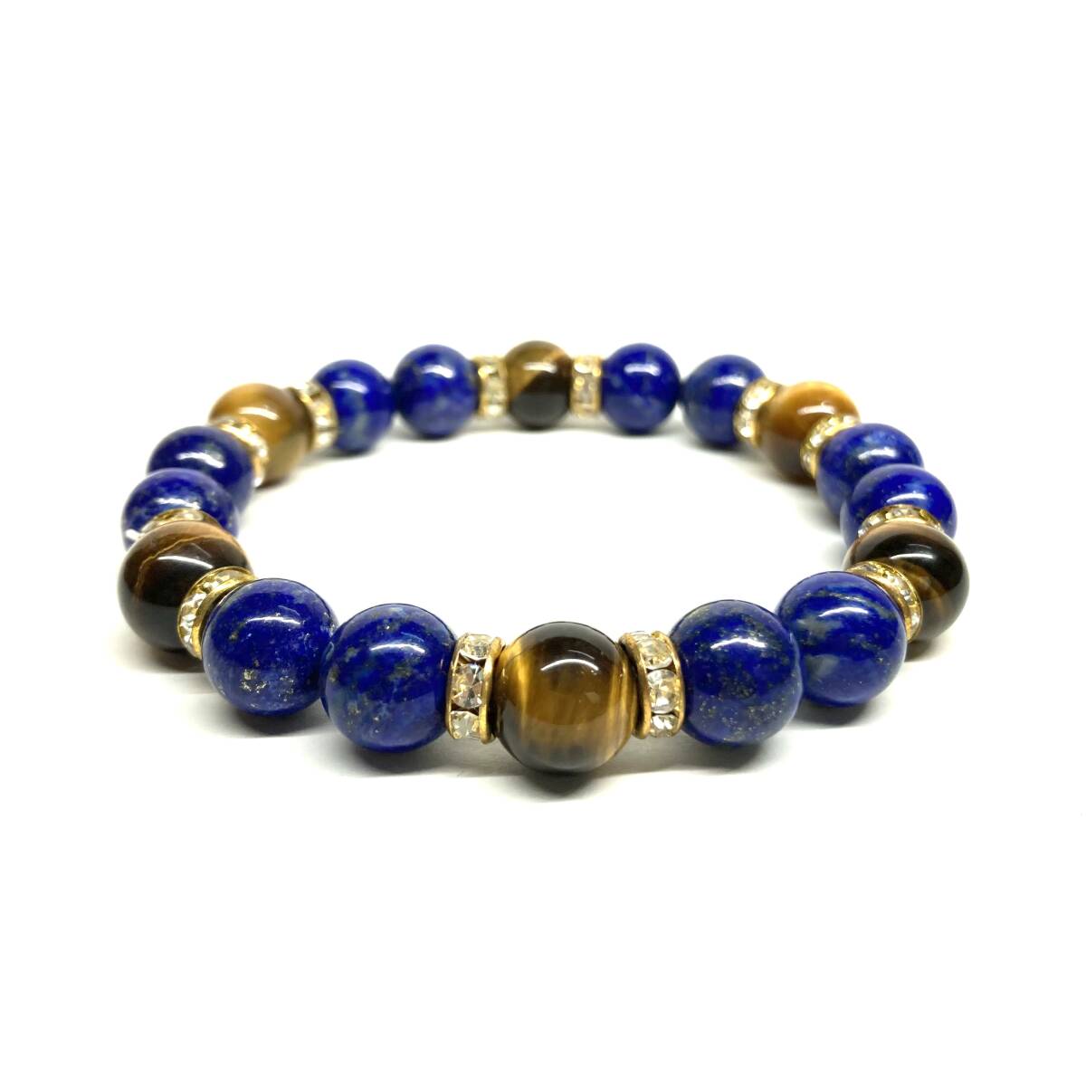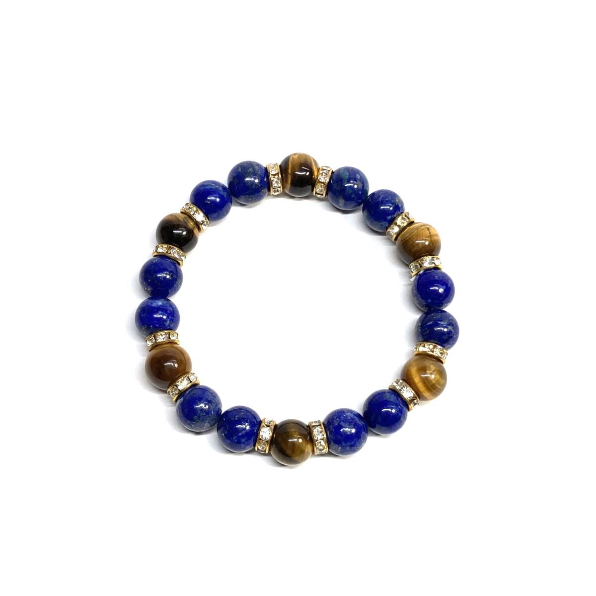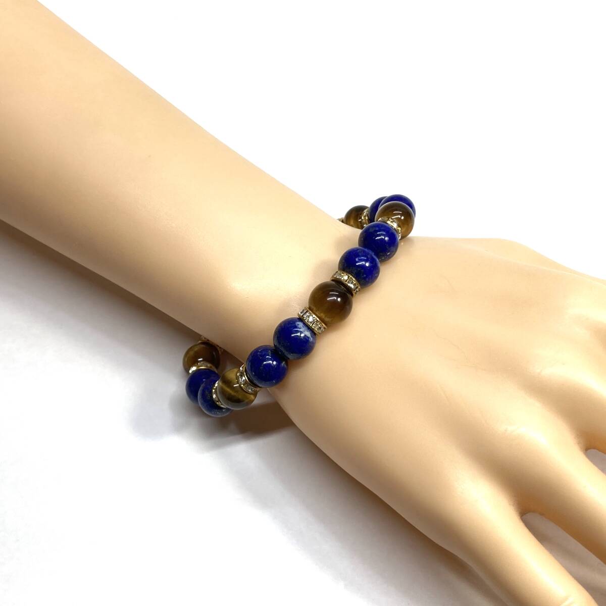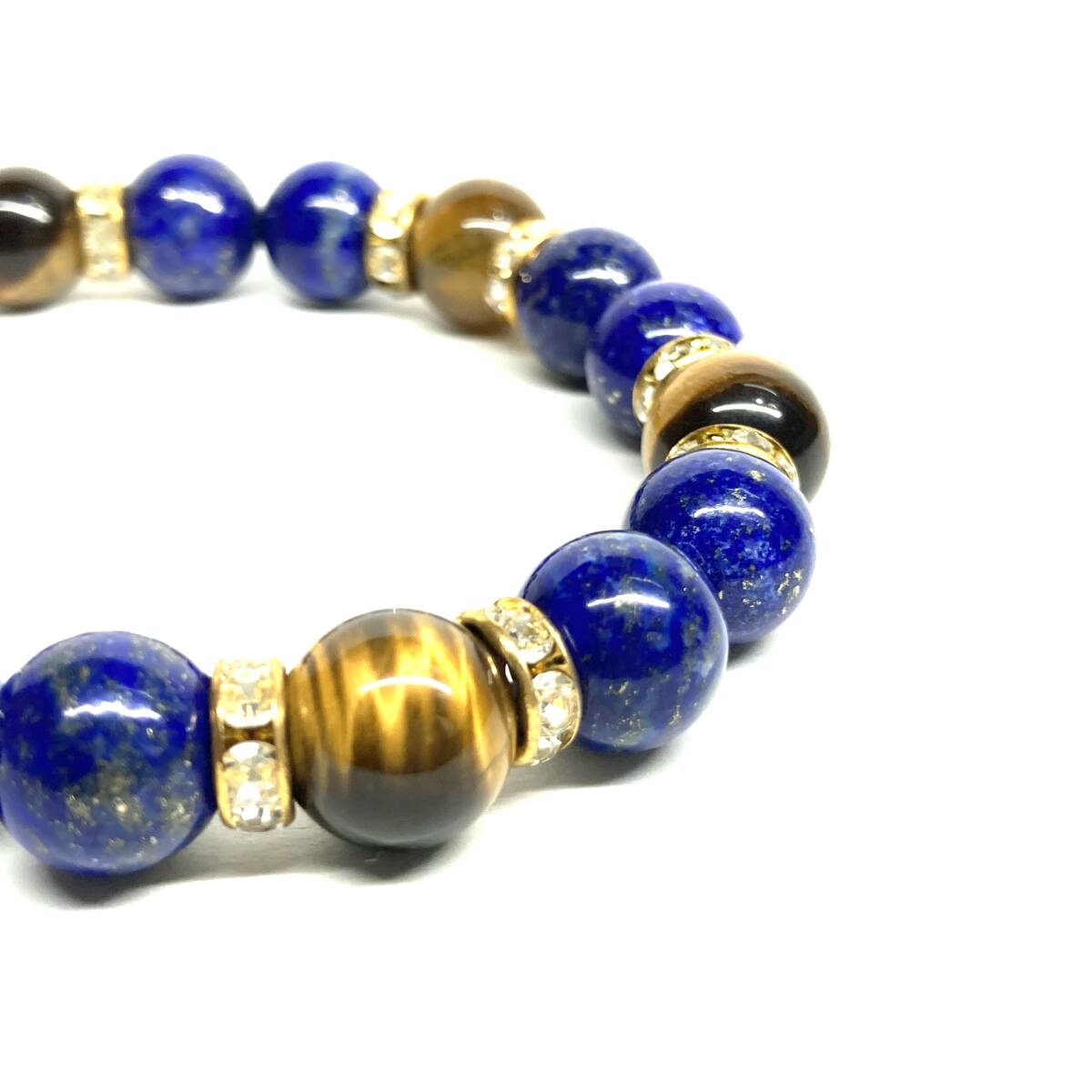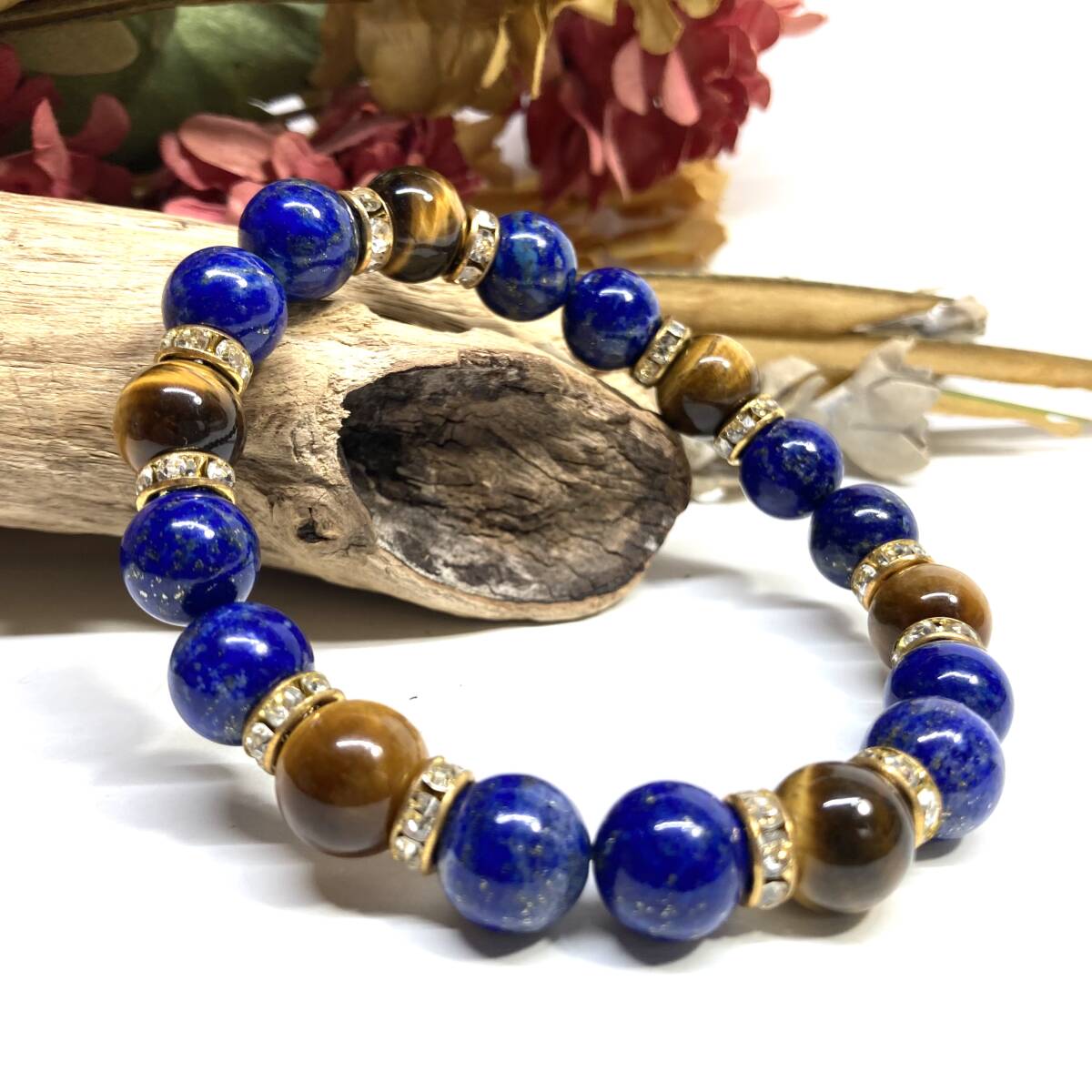 こちらは、ラピスラズリとタイガーアイを組み合わせたパワーストーンブレスレットです。間にはロンデルを挟み高級感あるデザインに仕上げております。石大きさは腕にも馴染みやすいように10mm玉で内周 約18cm(伸可能)です。(サイズ変更の場合は取引ナビにてご連絡をお願いします。) 数に限りがございますので気になる方はお早めにどうぞ。