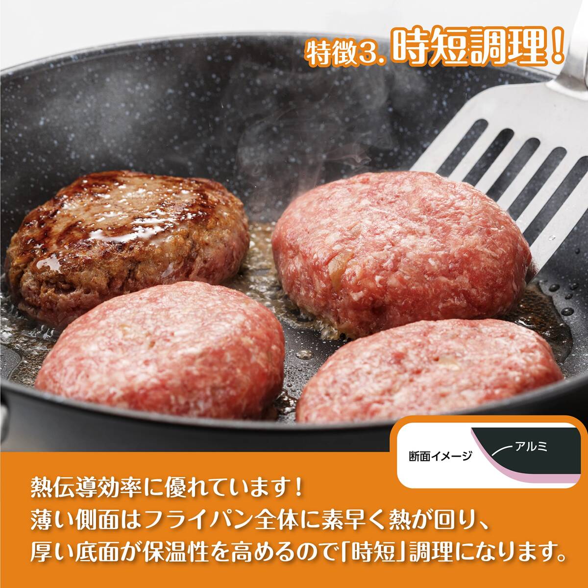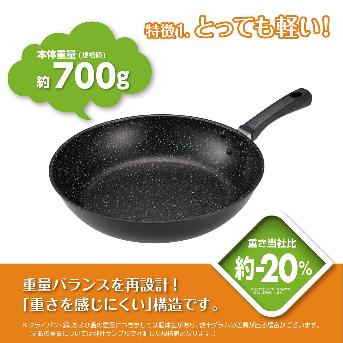 説明 【軽いシリーズ】 当社比約20%の軽量化を実現。軽くてラクラク、しかも本格派使いやすさにトコトンこだわったシリーズです。 特長アルミ鋼材の底面を厚く、サイド面を薄く加工するスピン製法を採用することで、熱効率を高めています。 特長ハンドルの長さを短くし、重量バランスを工夫することで『重さを感じにくい』構造に設計しています。 薄い側面はフライパン全体に素早く熱が回り、厚い底面が保温性を高めるので「時短」調理にも一役買う機能性フライパンです。
