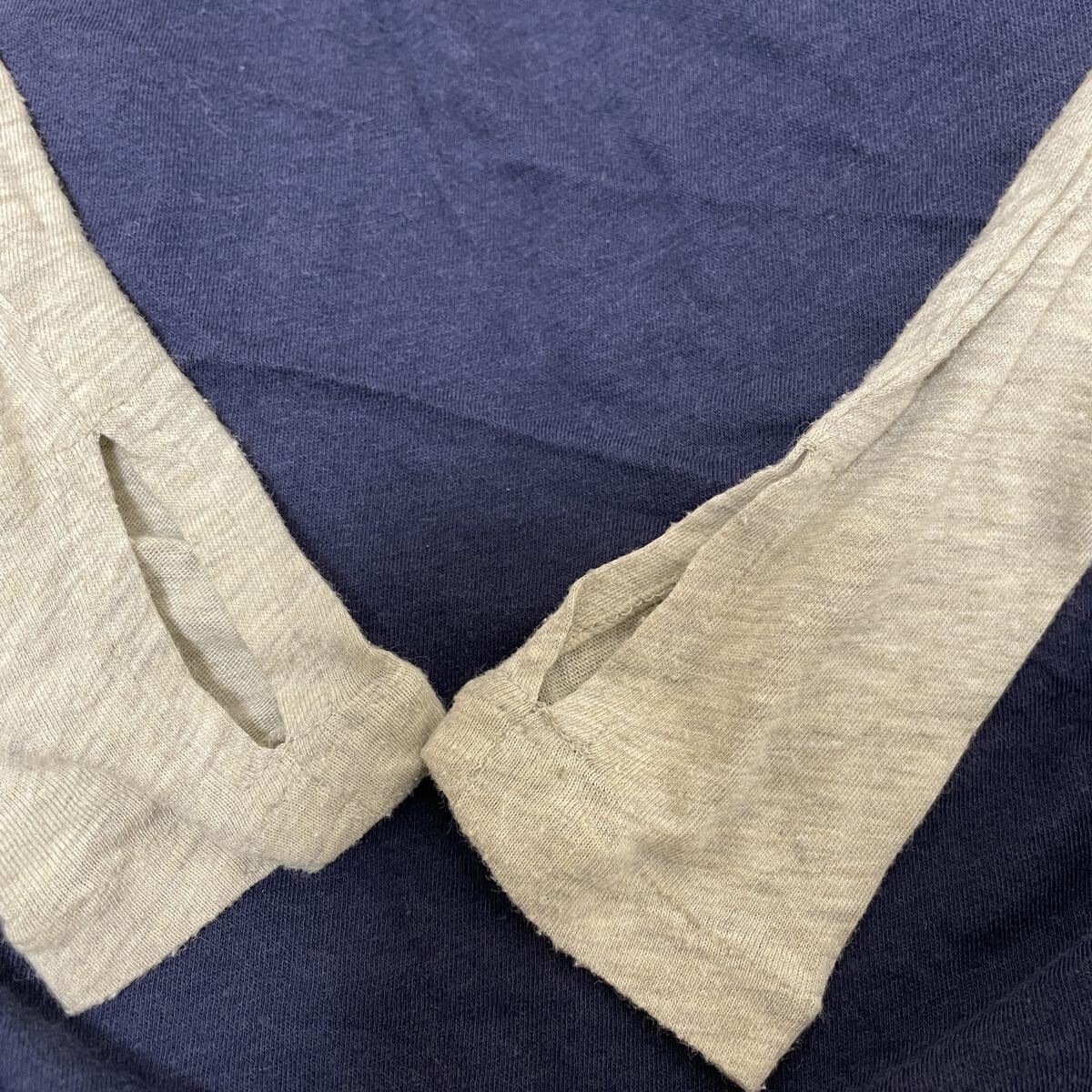 ネイビーの本体に、袖がグレーのラグランスリーブデザインとなっており、スポーティながらもシックな印象です。