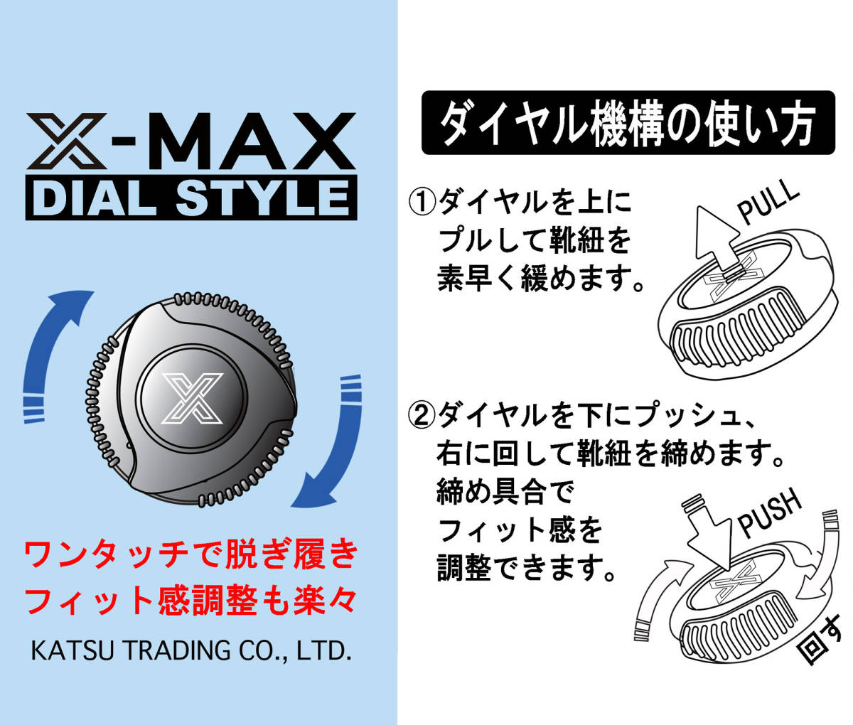 ダイヤルを回すことで靴紐が締まりフィット感を自由に調整可能、ダイヤルを上にプルすると靴紐が緩むので脱ぎ履きもワンタッチ。