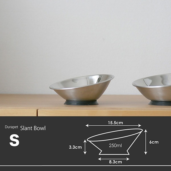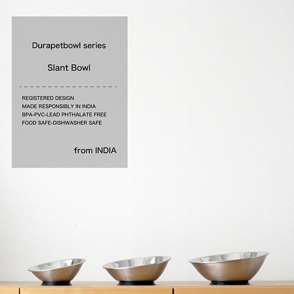 ふんばるステンレス食器「スラントボウル」最高品質ステンレス食器「-Durapet-デュラペットシリーズ」耐久性に優れた最高品質のステンレスを使用。食べるのに夢中でついつい滑ったり倒したりするお皿も、滑りにくい吸盤でしっかり安定。・食器自体に絶妙な角度がある為、ドライフードが自然に集まり、食べやすい・背面が高いのでこぼれにくい構造・底面の吸盤でがっちり固定*できるので、食べている時に前に進まない*フローリングなど、食器との間に空気が入る場所には食器が密着しない為不向きです。・BPA・PVC・鉛・フタル酸エステル不使用だから安心・安全・食器洗浄機の使用もOK ■サイズ(S):直径15.5cm、高さ低い箇所:3.3cm、高さ高い箇所:6cm※吸盤をくっつけていない状態■重さ:126g■材質:ステンレス・ラバーゴム■Made in : INDIA