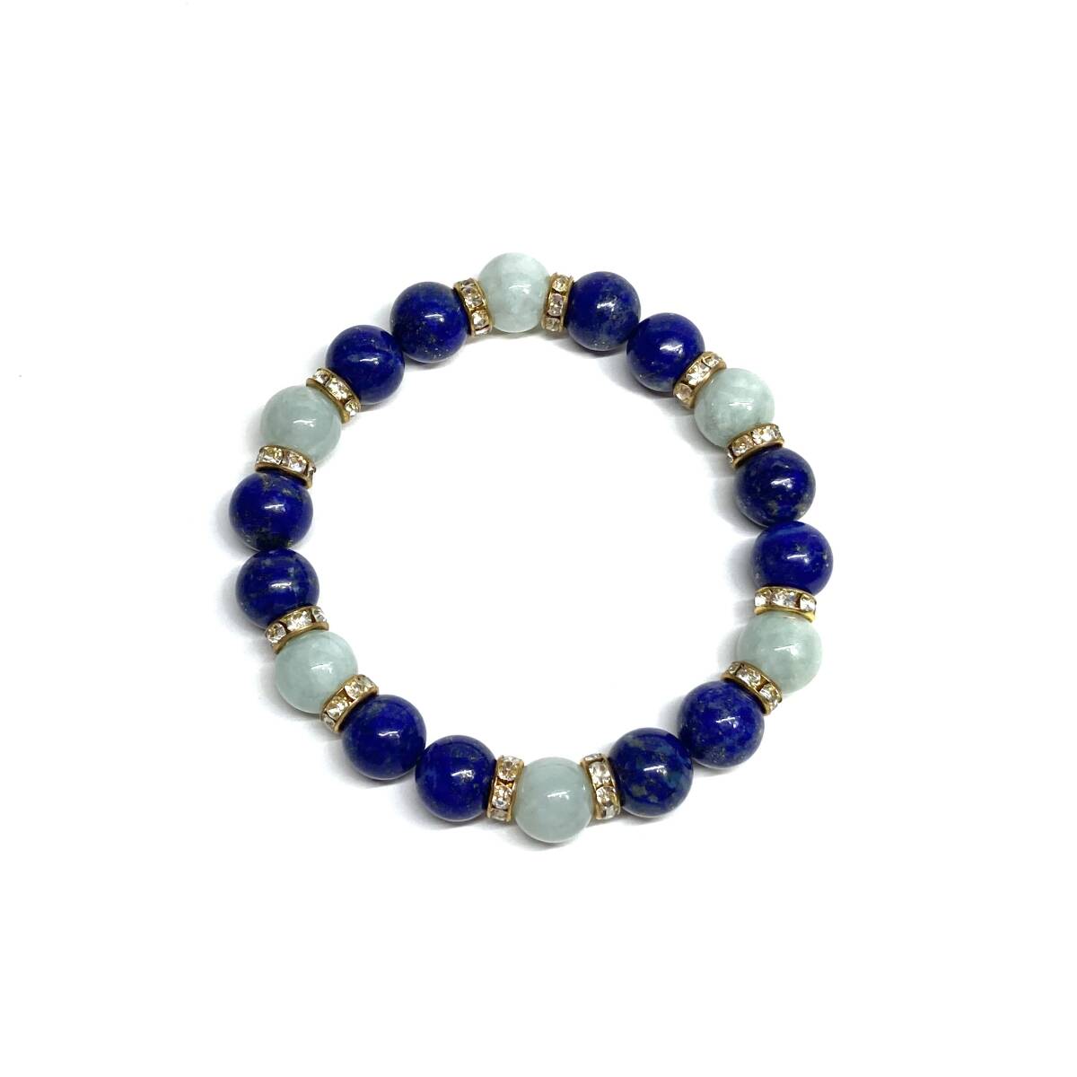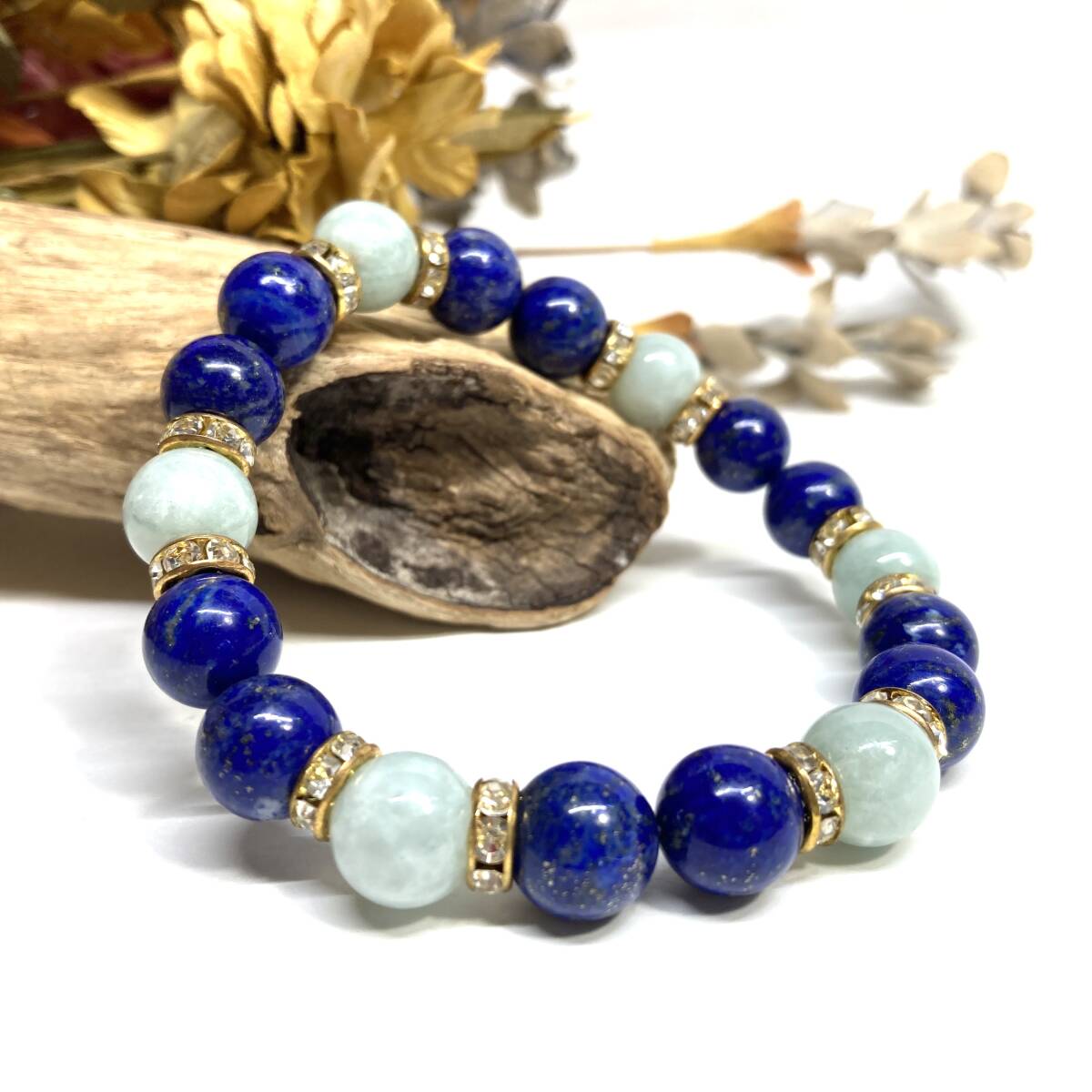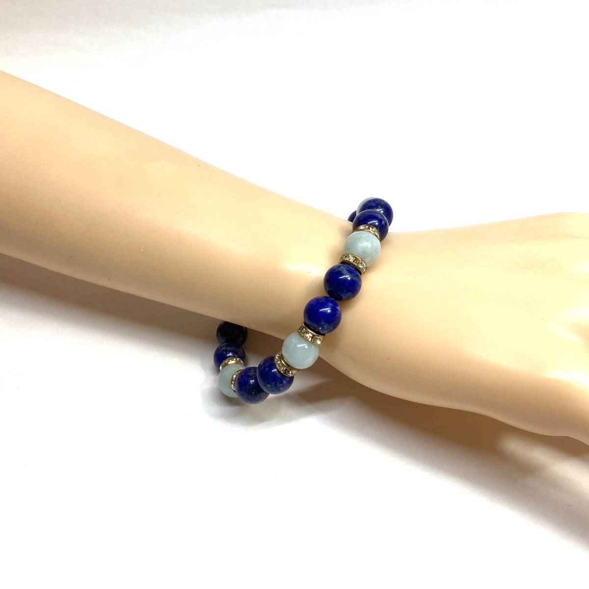 こちらは、ラピスラズリとビルマ翡翠を組み合わせたパワーストーンブレスレットです。間にはロンデルを挟み高級感あるデザインに仕上げております。石大きさは腕にも馴染みやすいように10mm玉で内径約18cm(伸可能)です。(サイズ変更の場合は取引ナビにてご連絡をお願いします。) 数に限りがございますので気になる方はお早めにどうぞ。