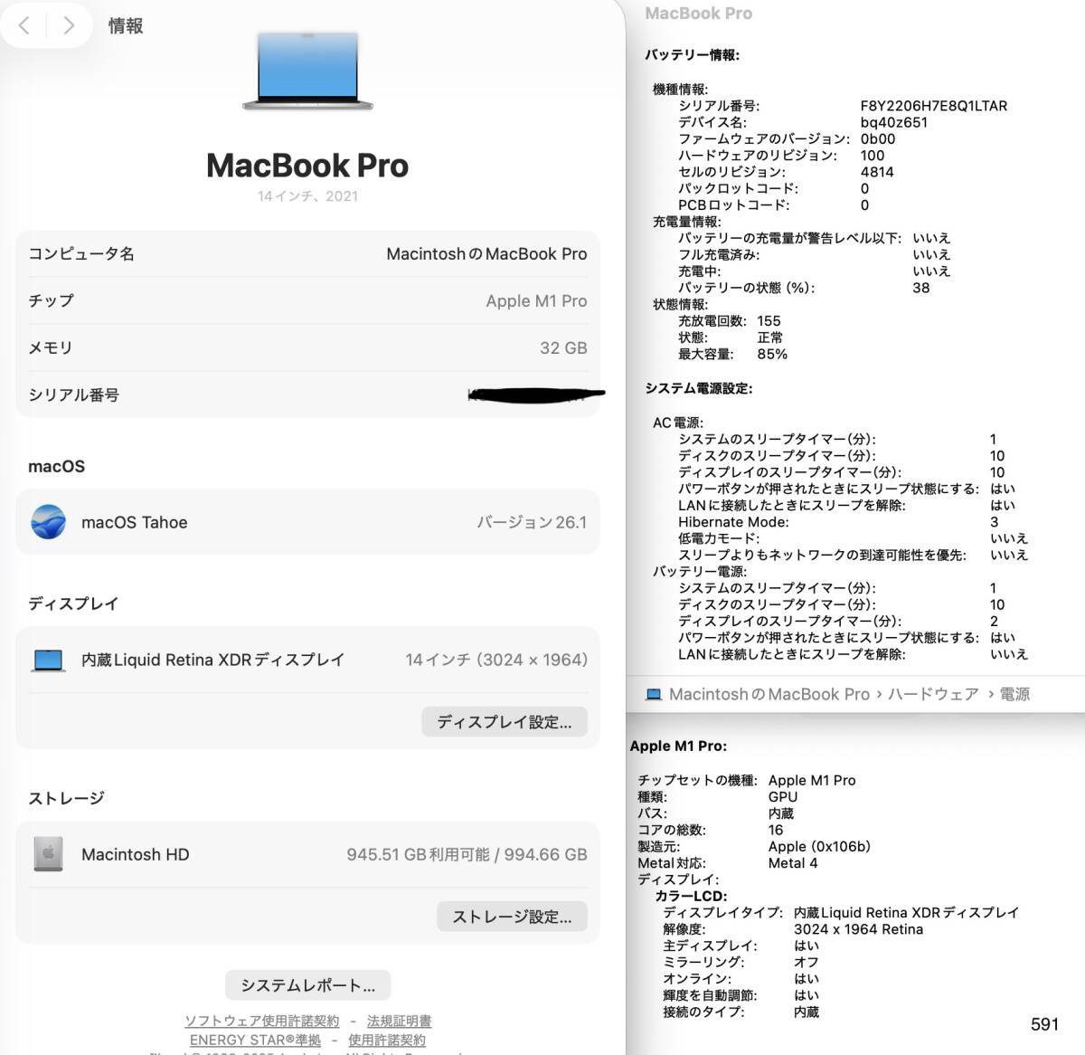[美品]Apple MacBook Pro 14inch 2021/Apple M1 Pro/メモリ32GB/SSD1TB/Windows11/Office 2024/591