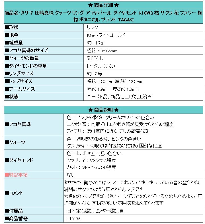 | 商品名:タサキ 田崎真珠 クォーツ リング アコヤパール ダイヤモンド K18WG 桜 サクラ 花 フラワー 植物 ボタニカル ブランド TASAKI | |