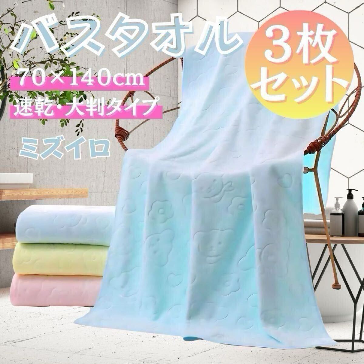 【3枚セット】バスタオル 水色 くま柄バスタオル 大判 速乾タイプ 70×140cm マイクロファイバー 軽量 お風呂 プール ジム アウトド