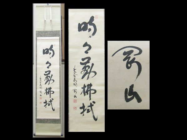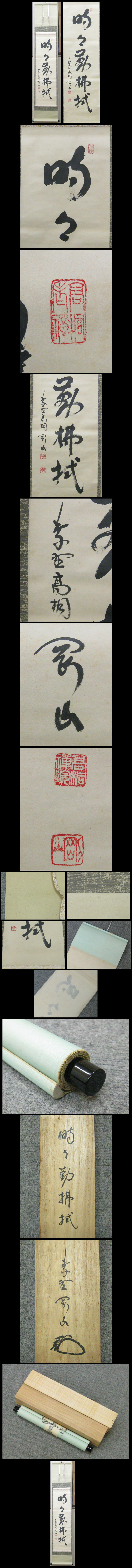 【松長剛山】 大徳寺高桐院住職。昭和18年 大阪府能勢町生まれ。 昭和25年 大阪府長杉寺 松長元祥に 就いて得度。のち京都建仁寺僧堂で、竹田益州に参禅。 昭和46年 大徳寺塔頭高桐院 住職。三重県上野市龍王寺住職を兼務。 大徳寺禅語録集成編纂委員。久田流有栖川 系茶道13代家元。細川三斉流茶道顧問。 「時々勤佛拭」 人間は本来清らかな心を持っているが、煩悩によって曇ってしまうため、 常に心を磨き、塵や埃を取り除く努力を怠ってはならないという意味です。 ★商品サイズ★ ■掛軸 171×32cm ■作品 101×29cm ★商品の状態★ 作品に時代のしみ汚れがあります。 表具に少しのしみ汚れがあります。 裏側に時代のしみ汚れがあります。 ご承知のうえご入札をお願いします。 時代など詳しくは画像にてよく確認のうえでご検討いただければと思います。 どうぞよろしくお願いいたします。 |