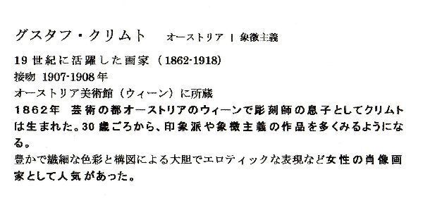 | 作家名・画歴 | グスタフ・クリムト 1862-1918 1862年ウィーン近郊に生まれる。 |