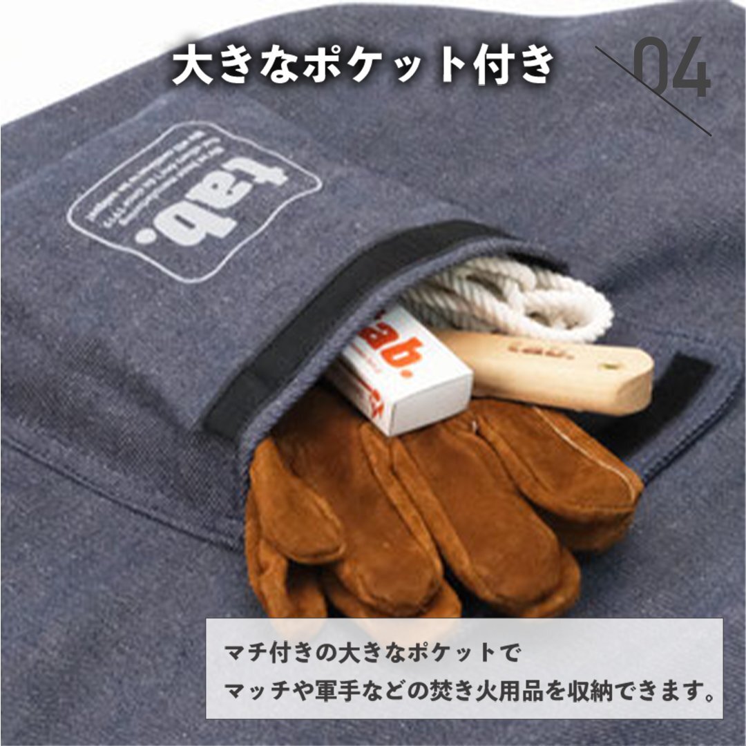 缶ストーブやマッチなど焚き火セットをワンパックに。アイテムを取り出した後は、燃料のギャザリングバッグにも使えます。丈夫なデニム生地で長い枝や薪も気にせず詰め込めます。