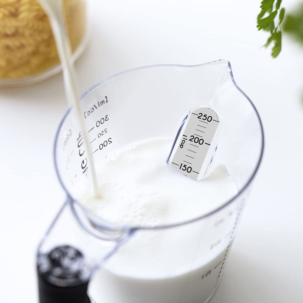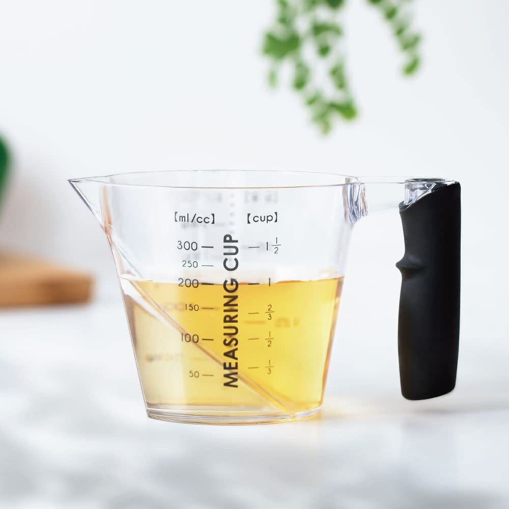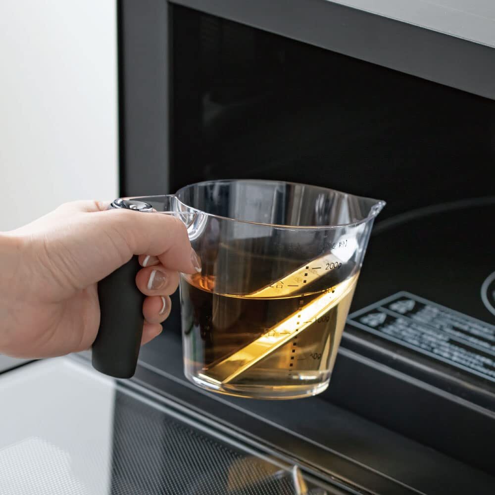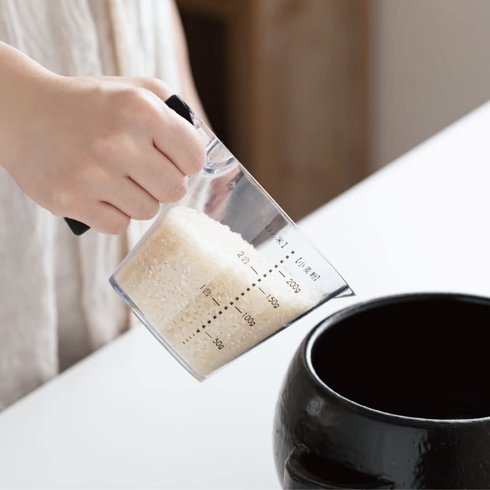 上から覗けて計りやすい目盛り。 カップ内部にメモリがあるので注ぎながら上から覗いて計量できます!左利きの方も使いやすいデザイン♪ 本体は軽くて、握りやすいラバーグリップを採用。 また、電子レンジ・食洗機対応、小麦粉やお米も計量可能でとっても機能的。