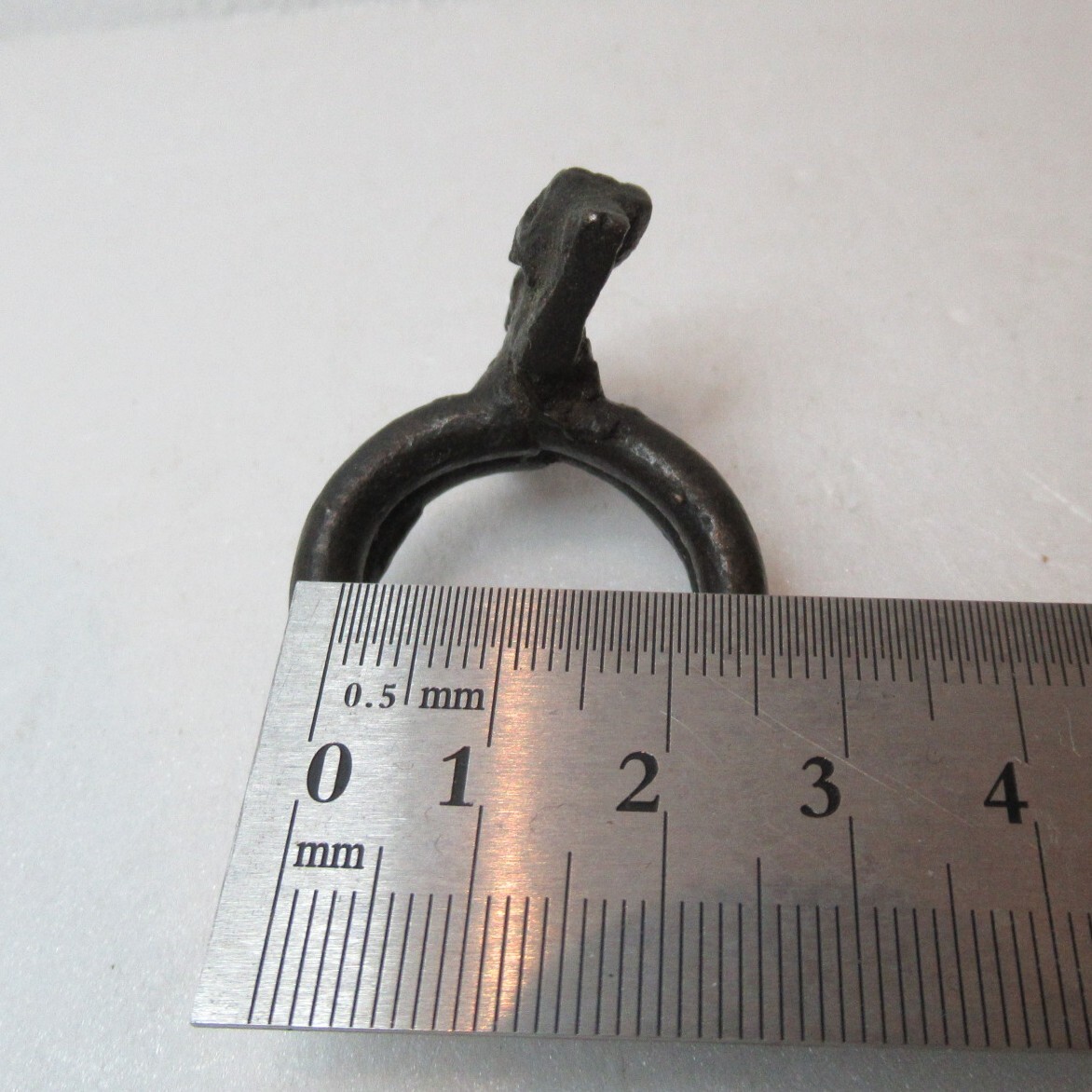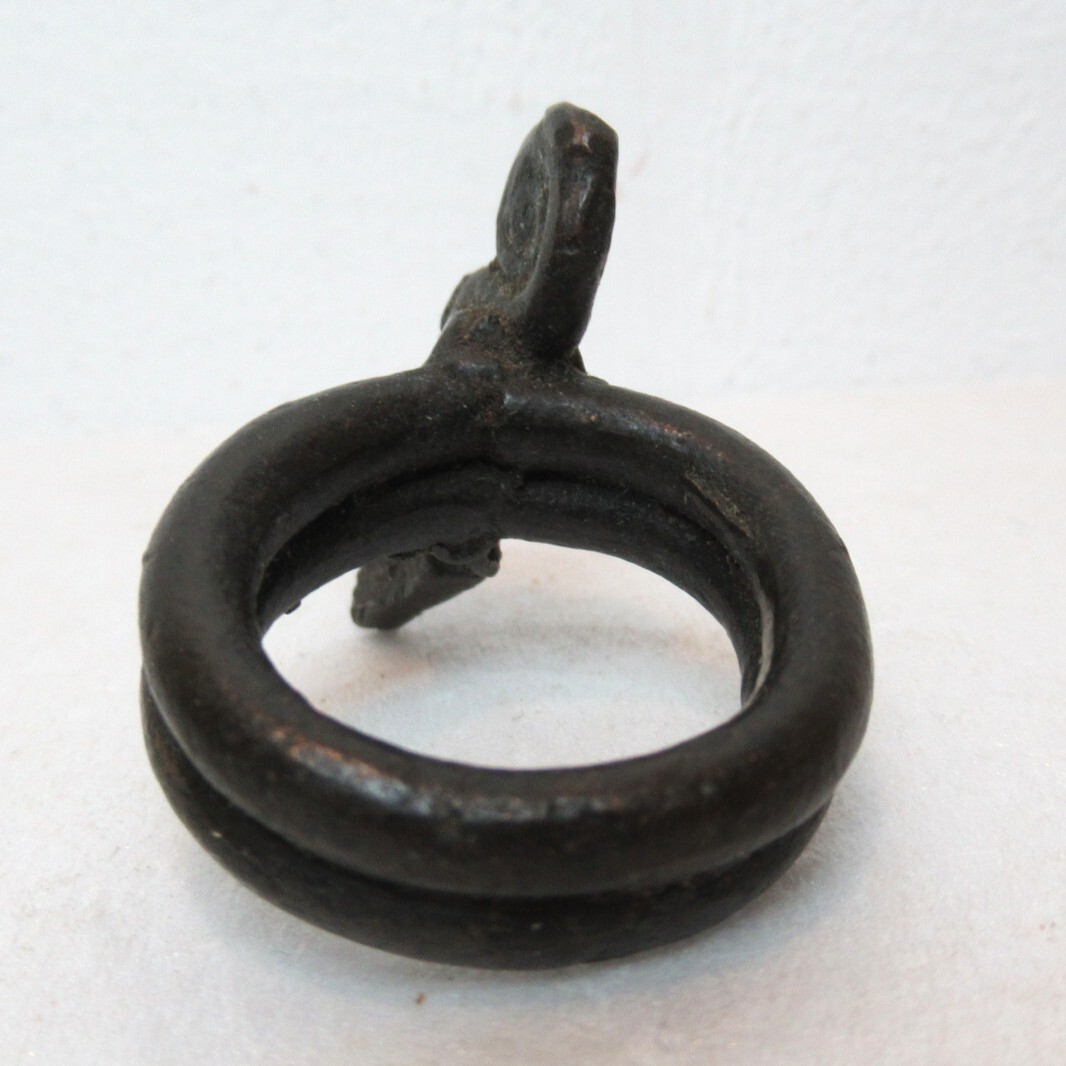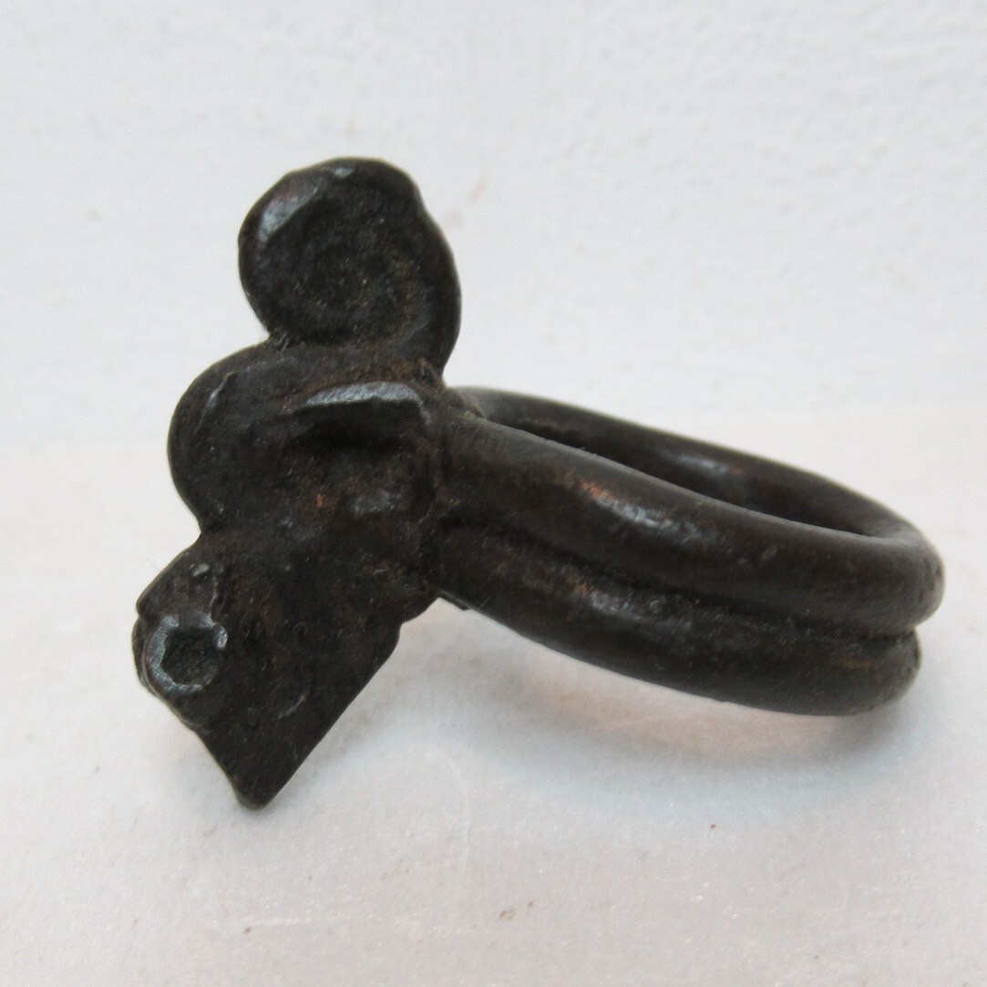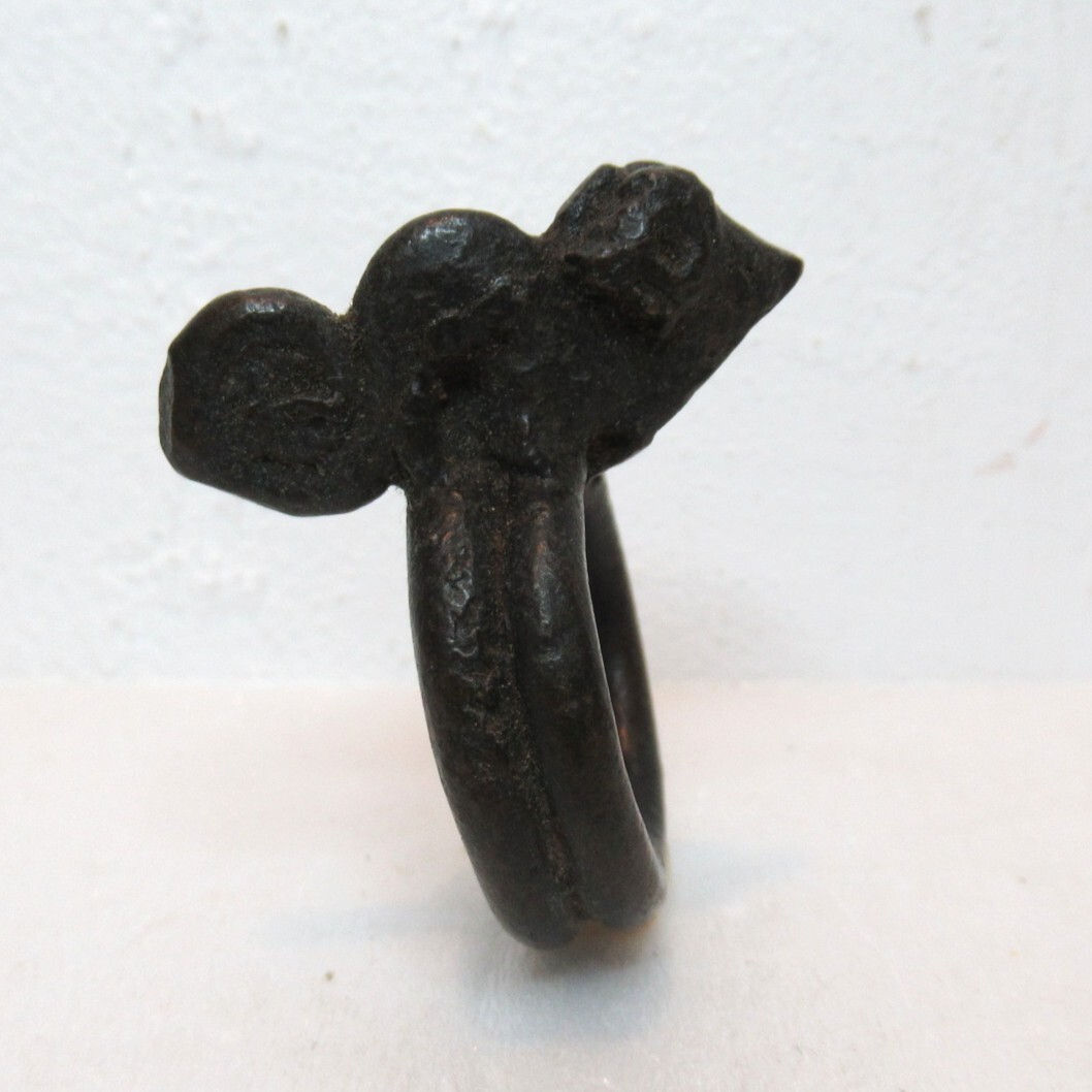 セヌフォ族による真鍮工芸品。ロストワックスの技法によってて作られた。カメレオンの指輪。カメレオンの指輪は男性にのみ使用され、形は年齢層によって通過儀礼の段階を表わされいる。セヌフォの社会ではカメレオンは賢明さを表わし、それを付けることは自身を賢明にすると信じられている。
