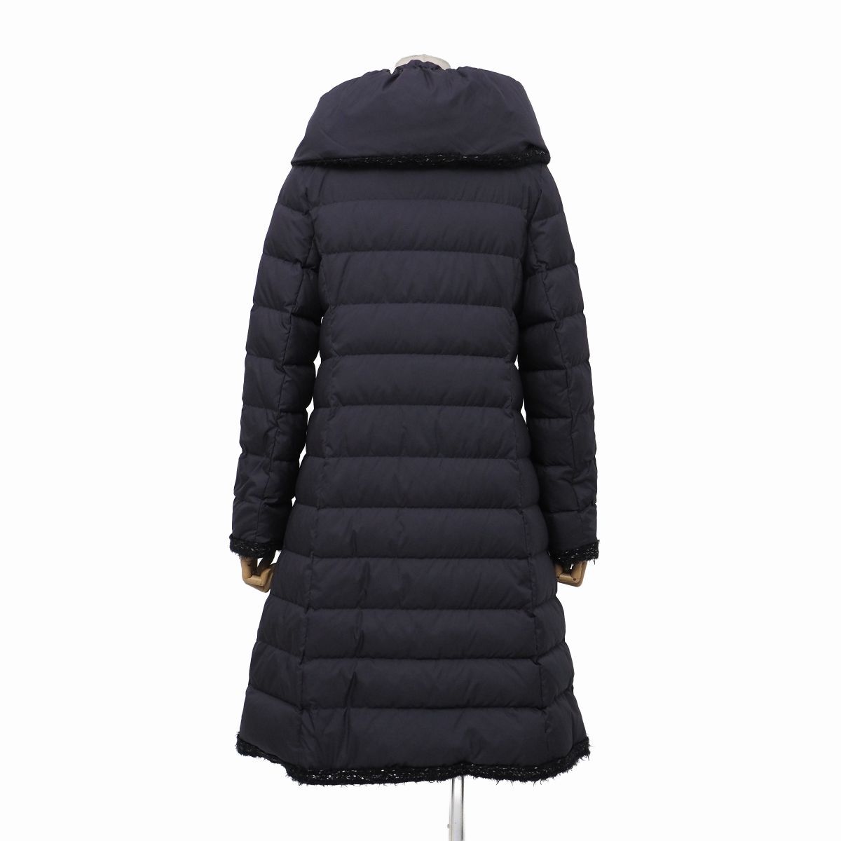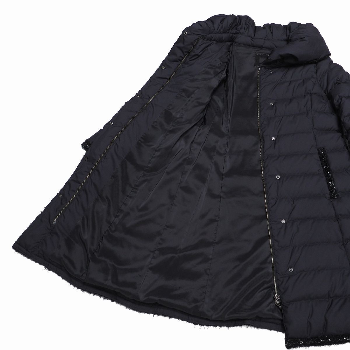 ボリュームのある襟元が華やかな印象を与え、首元まで暖かく着用できるデザイン◎前立てやポケット周りには上品なブレードトリミングが施され、女性らしいエレガントな雰囲気を演出します。
