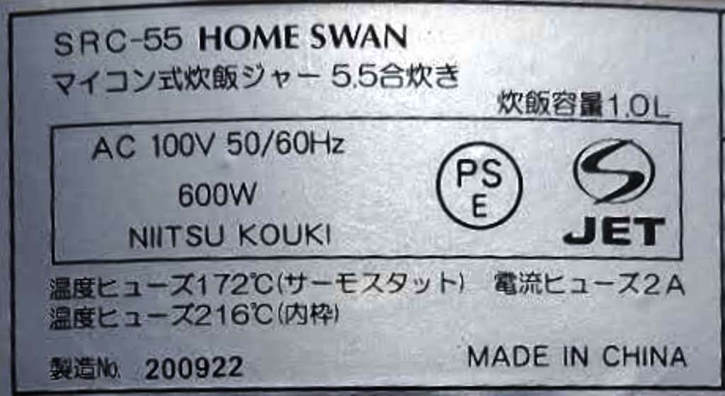 新津興器 ★ HOMESWAN マイコン式炊飯ジャー5.5合炊き 業務用炊飯容量1.0L ★ 中古作動美品