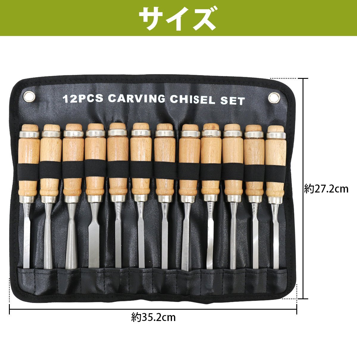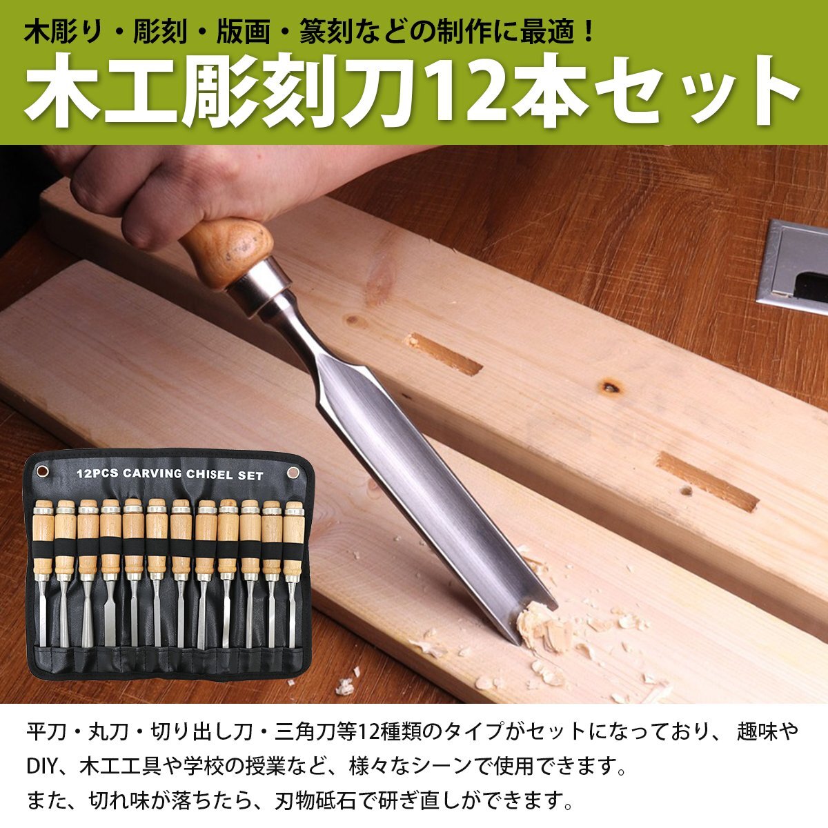 『彫刻刀 12本セット』鑿 ノミ 木工 木彫り 木像 木槌 彫刻 削り 工具 のみ 収納袋付 大工道具 小学生 大人 カービングナイフ