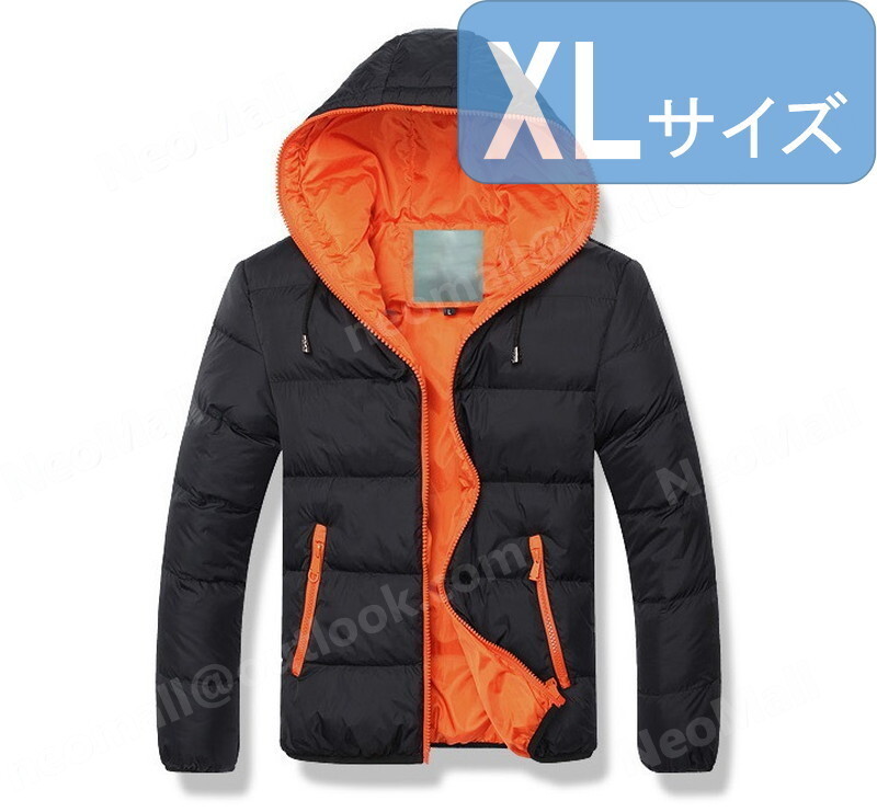 フード付き メンズ ダウン 004 ブラック×オレンジ XLサイズ 中綿ダウン 中綿ベスト キルティング アウター 防寒 秋冬 暖かい