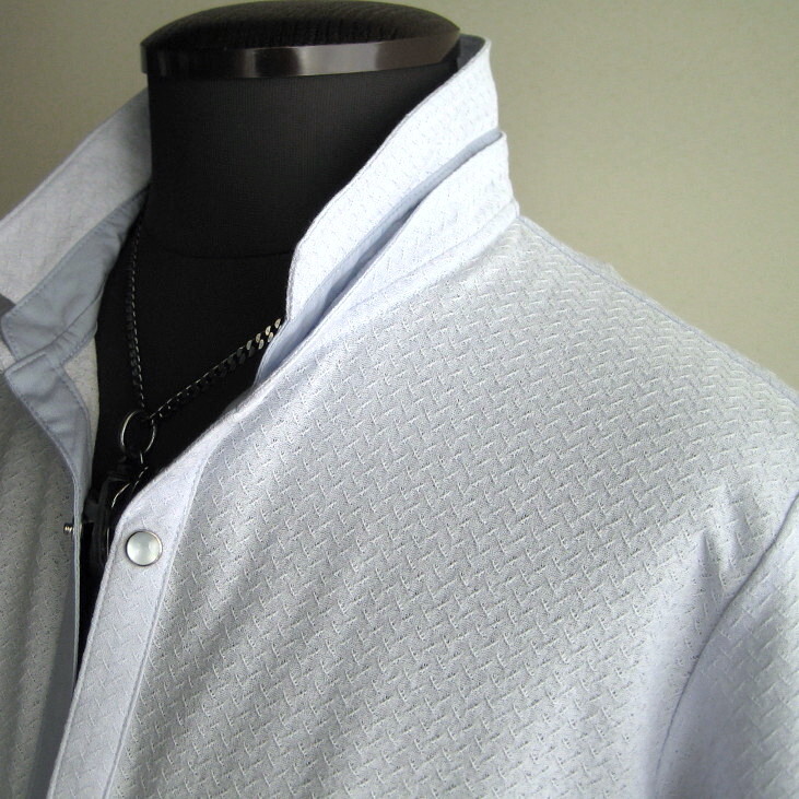 ■シャツ地をアクセントとして別地使いにし台衿を二重にしたオリジナルの衿デザインを採用
