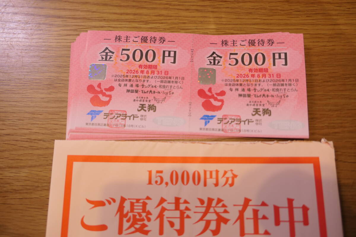 ●テンアライド(天狗)の株主優待券15000円分(500円券×30枚)です。